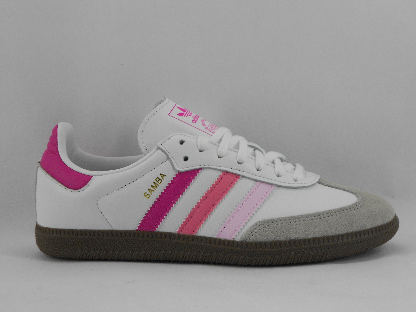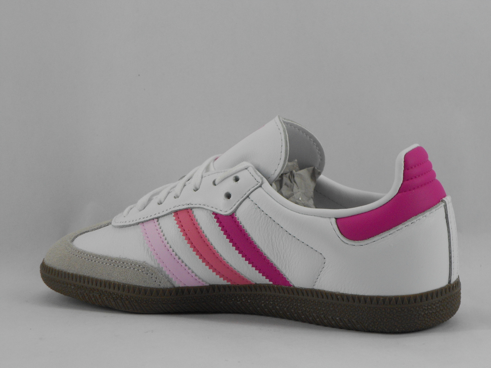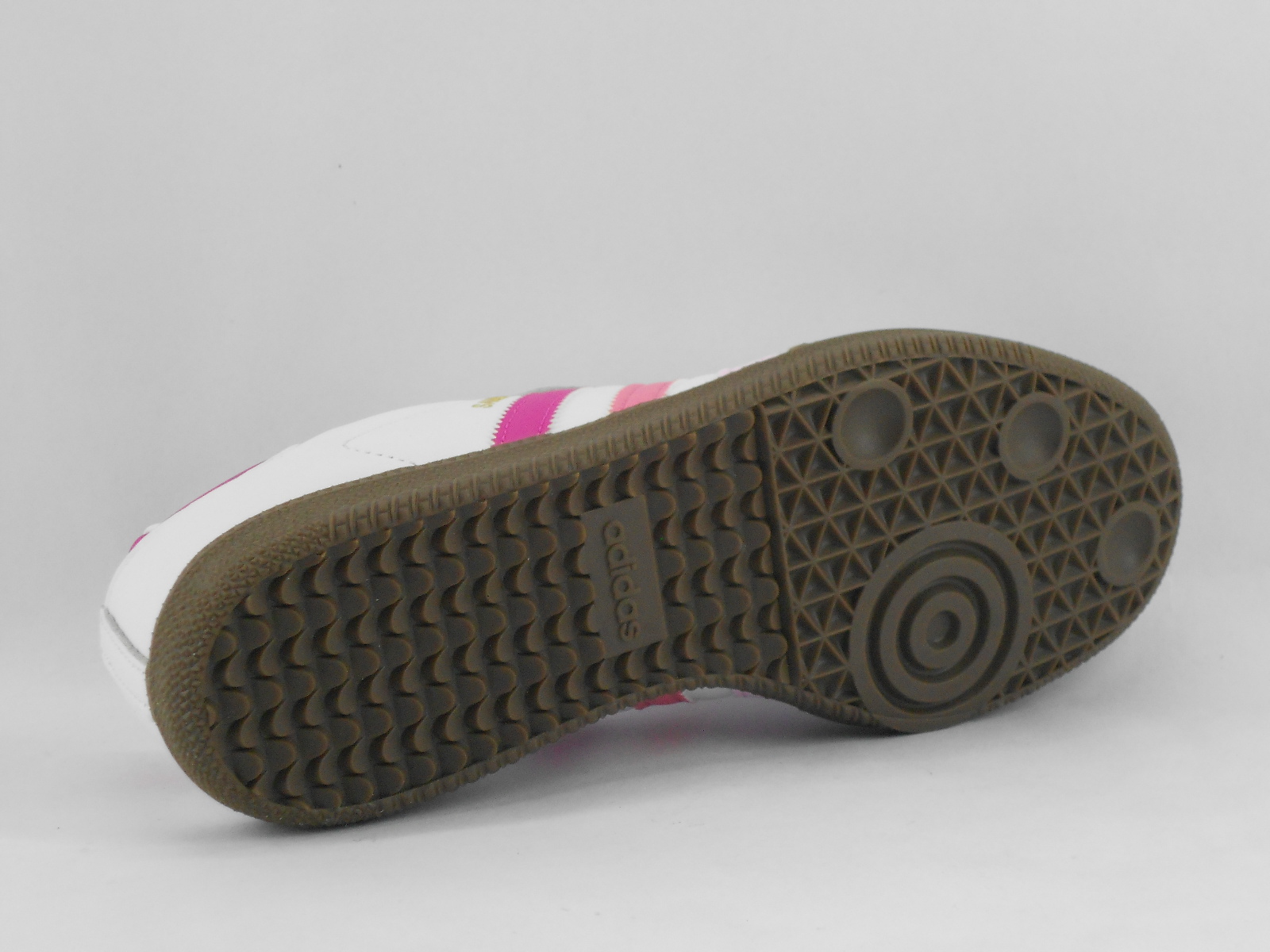 Uma combinação vibrante de tradição e frescura, este ténis Adidas Samba branco com riscas rosa traz um toque desportivo e moderno ao visual casual