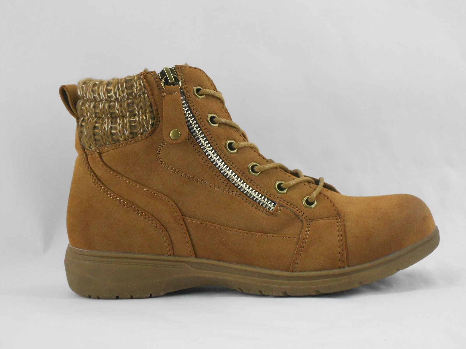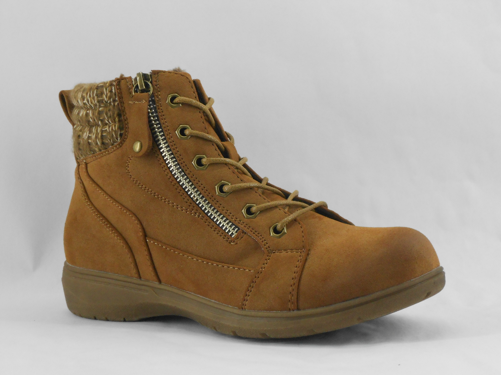 Versátil e confortável, esta bota feminina em tom camel combina estilo casual com funcionalidade. O design com atacadores e fecho lateral facilita o calçar e garante um ajuste seguro, enquanto o detalhe têxtil no tornozelo adiciona um toque moderno e acolhedor.