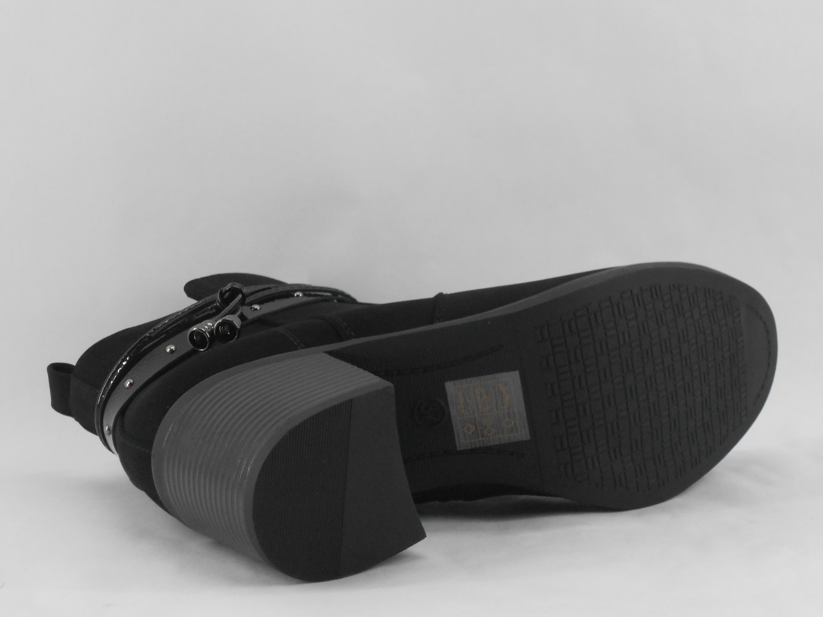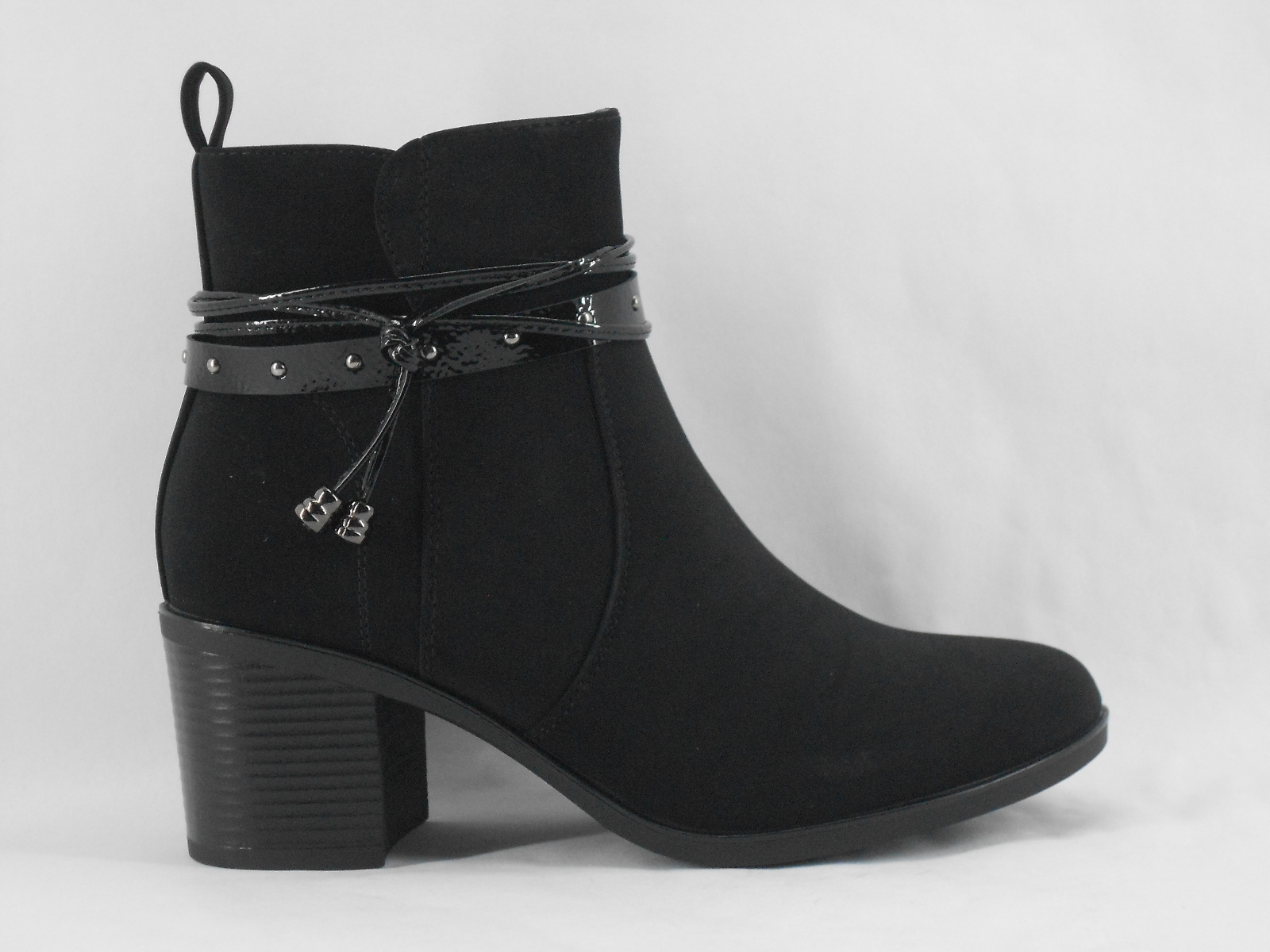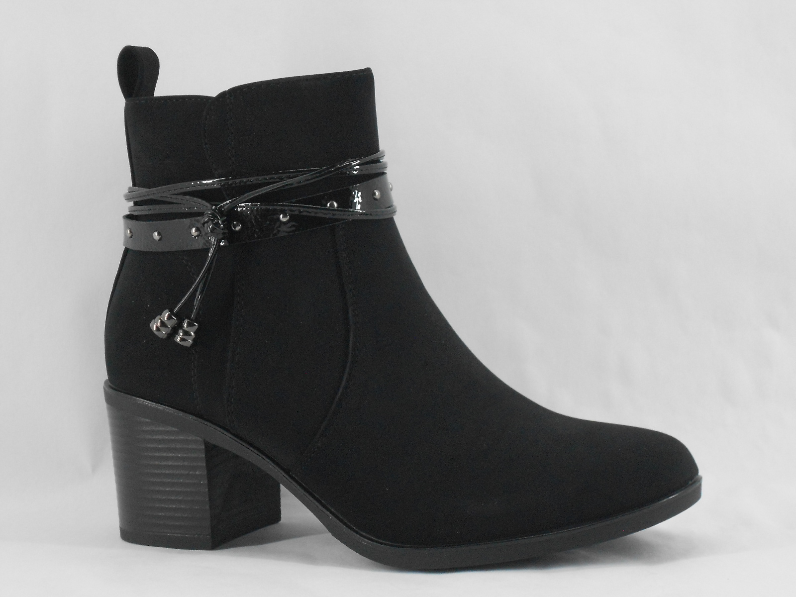 Um modelo moderno e cheio de charme, estes botins em camurça cor preto destacam-se pela tira decorativa em verniz com pormenores metálicos. Elegantes e versáteis, combinam perfeitamente com looks casuais ou mais sofisticados, garantindo conforto e estilo em qualquer ocasião.