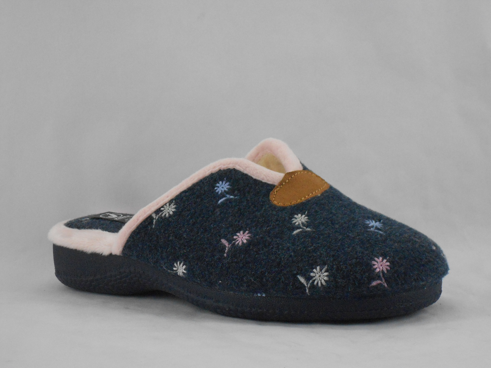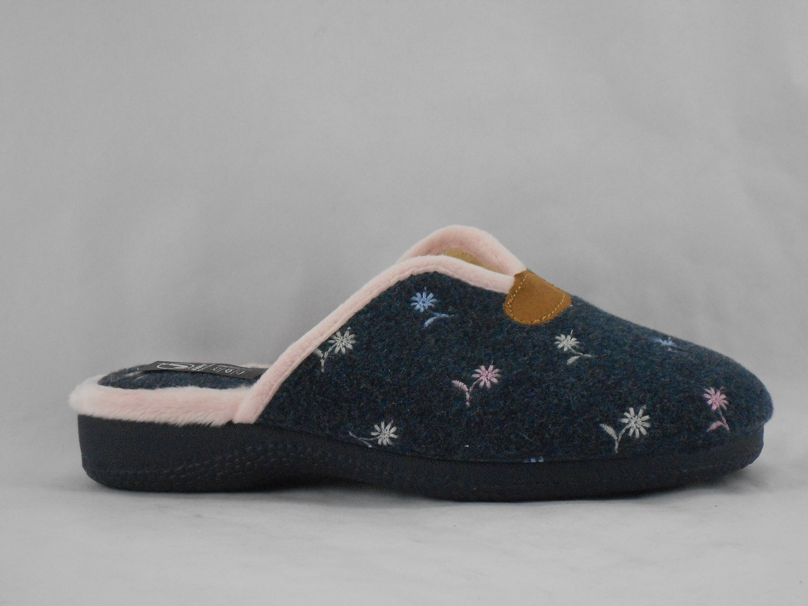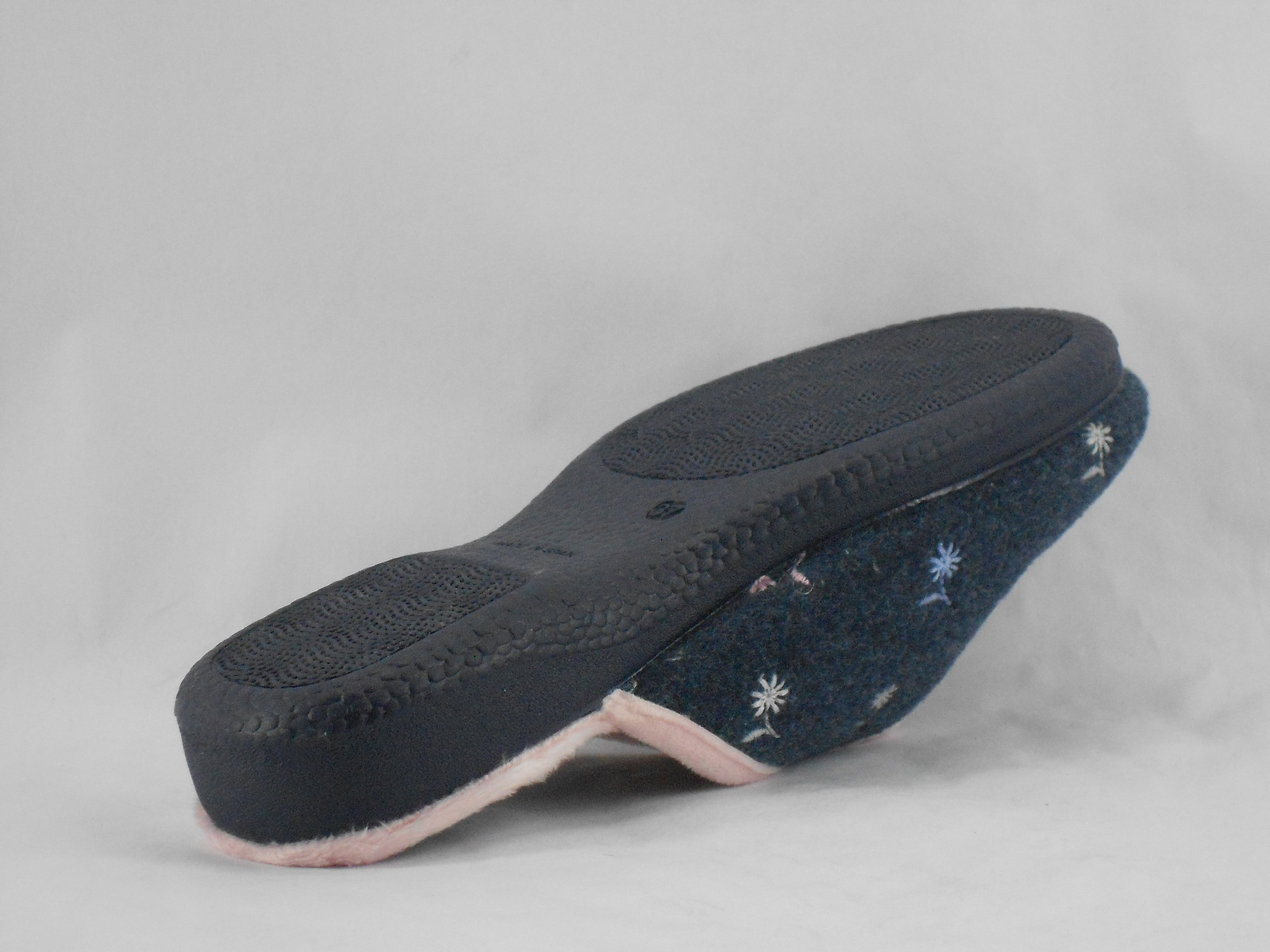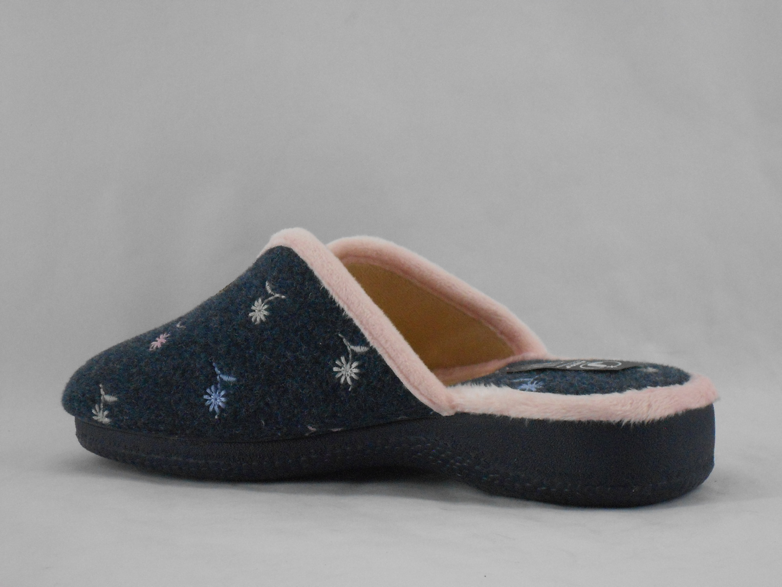 Este chinelo feminino azul conjuga conforto e delicadeza num modelo ideal para relaxar em casa. O tecido exterior apresenta um subtil padrão bordado com pequenas flores coloridas, acrescentando um toque feminino e acolhedor.