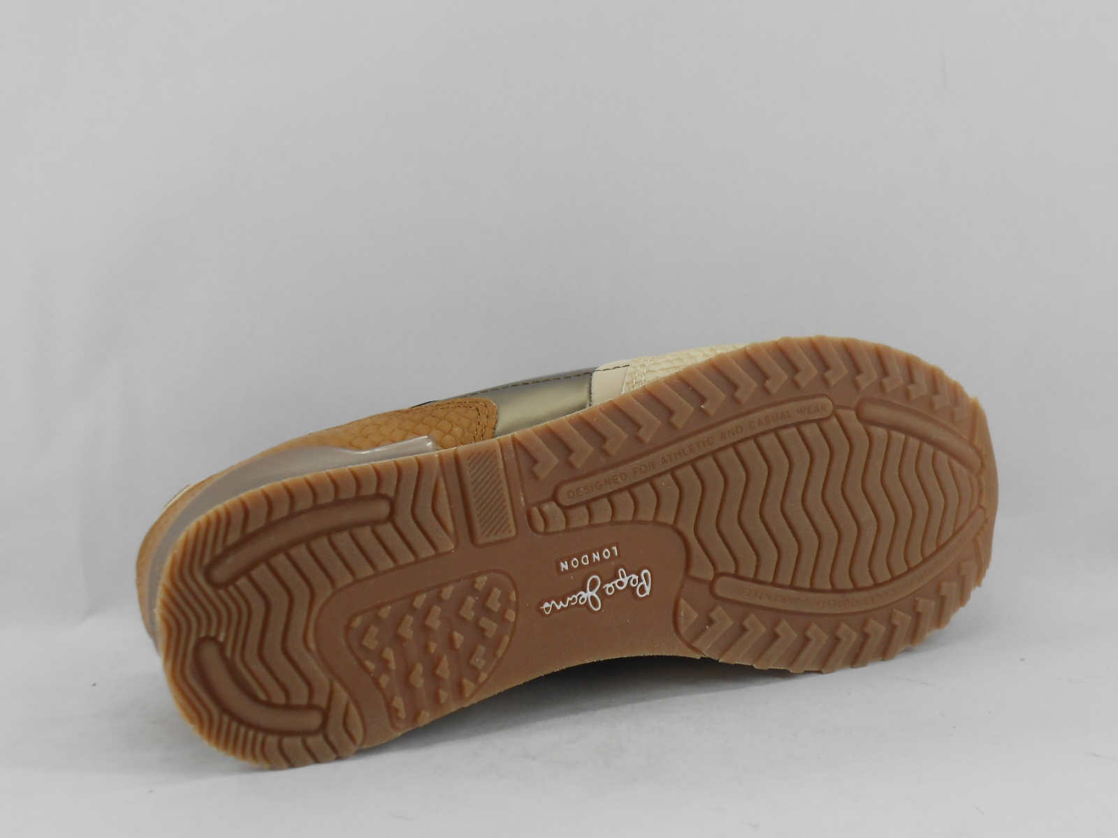 Este ténis da marca Pepe Jeans destaca-se pelo visual sofisticado em tons de bege com elegantes detalhes dourados, ideal para um look moderno e requintado