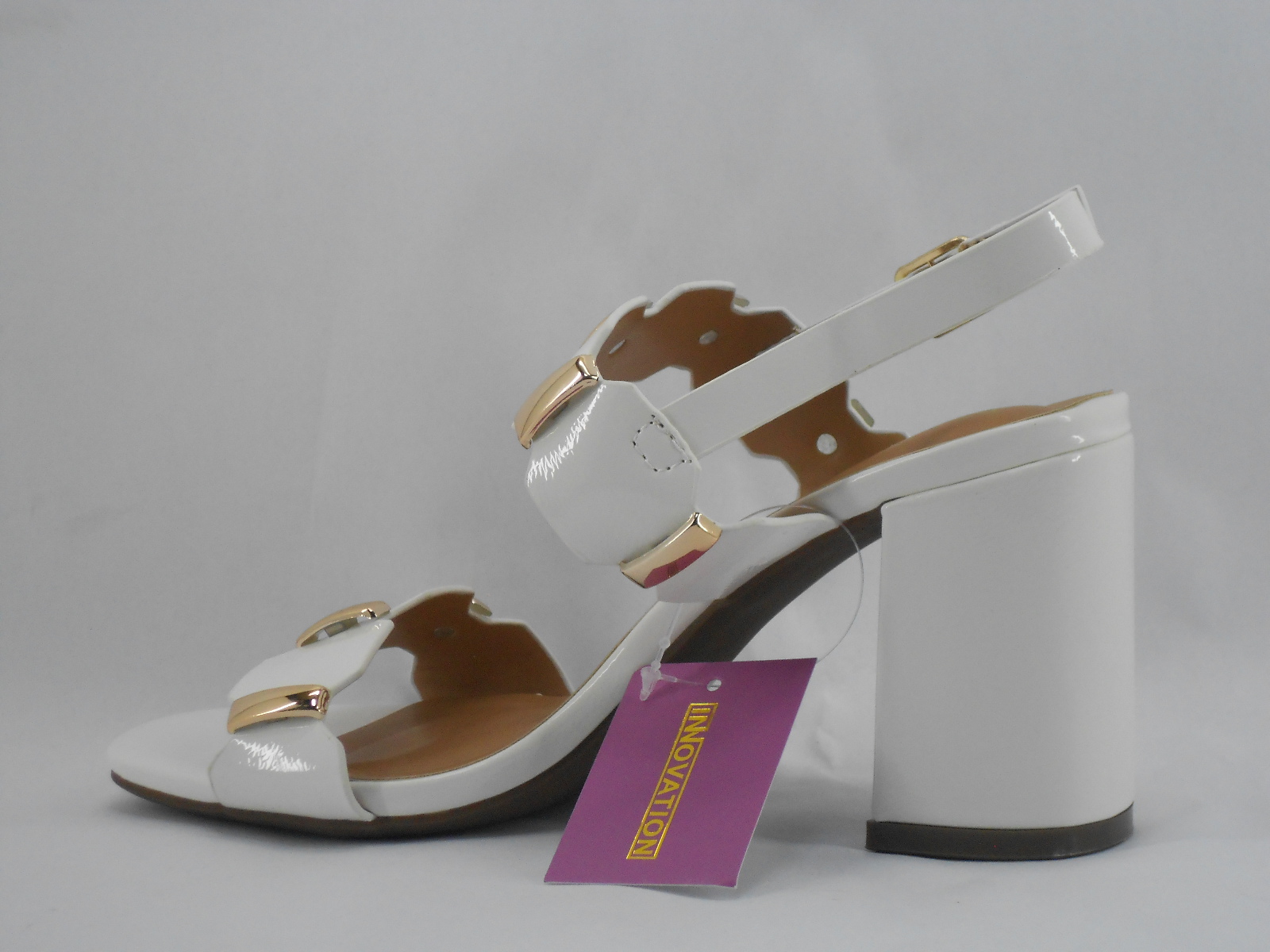 Sandália Branca com Detalhes Dourados e Salto Alto