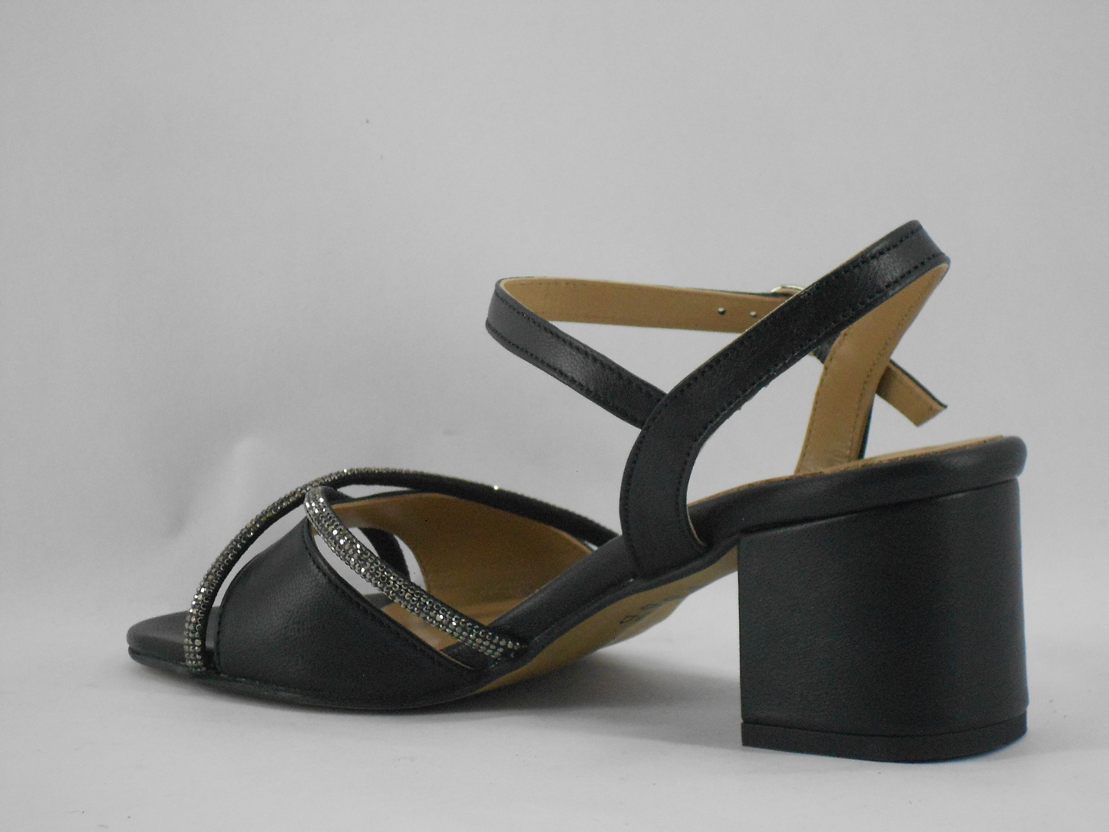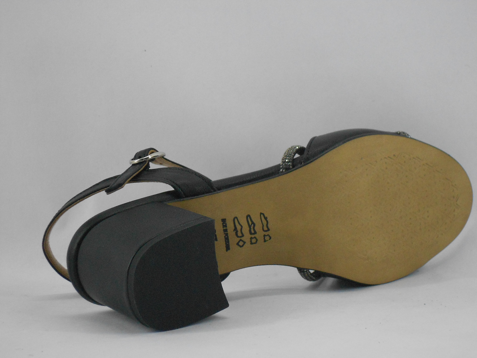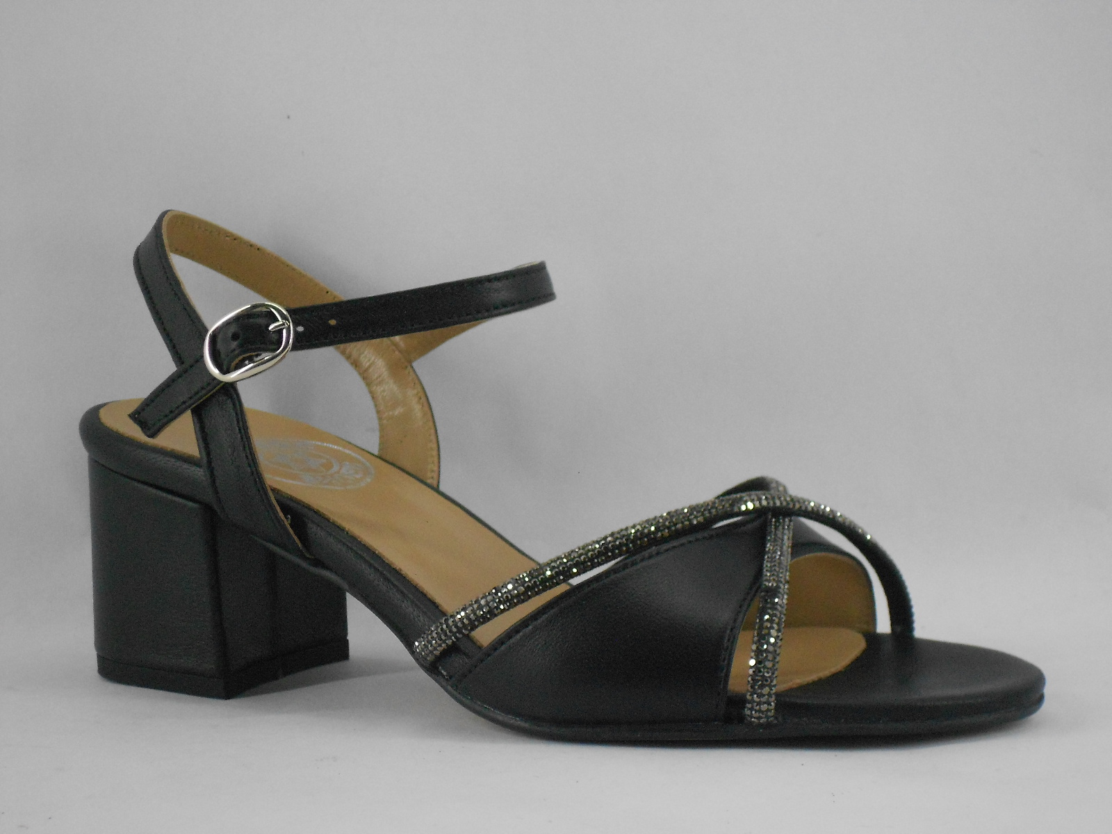 Ideal para brilhar em ocasiões especiais, esta sandália preta destaca-se pelo seu acabamento metalizado e pelas tiras finas com aplicação de brilho, que conferem um toque sofisticado e elegante ao visual. A fivela ajustável no tornozelo proporciona segurança e conforto ao caminhar.