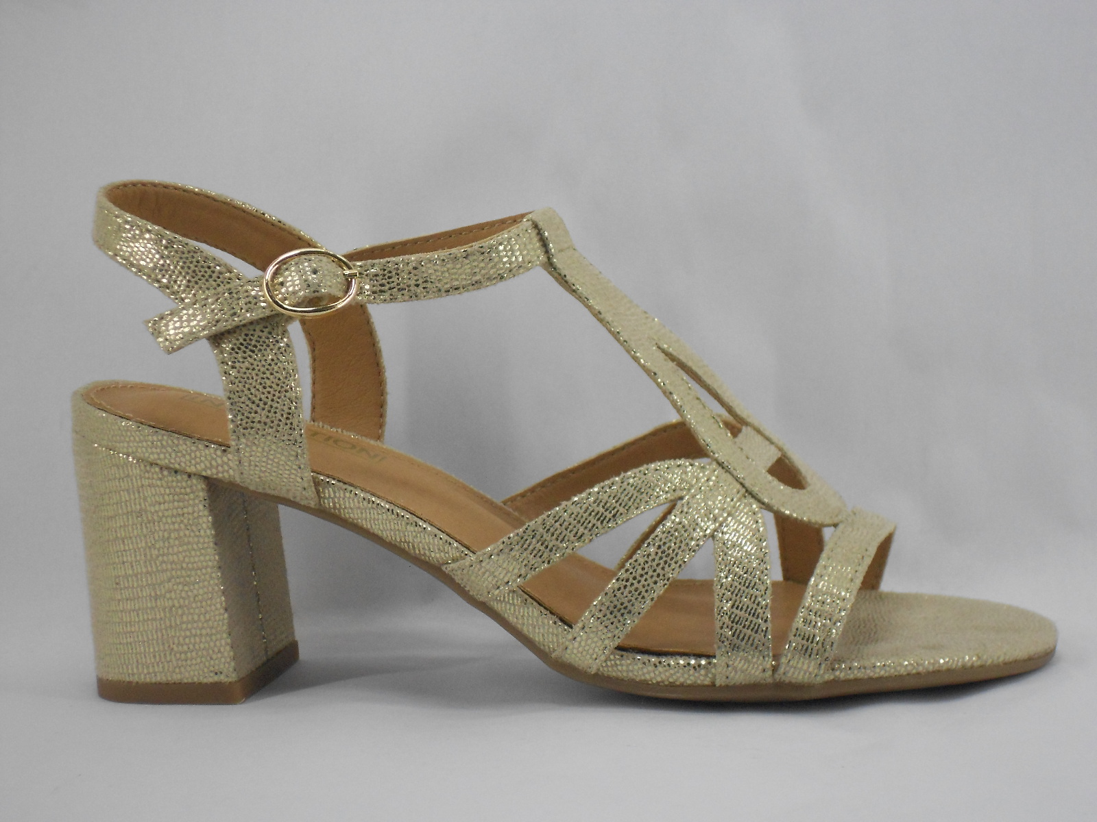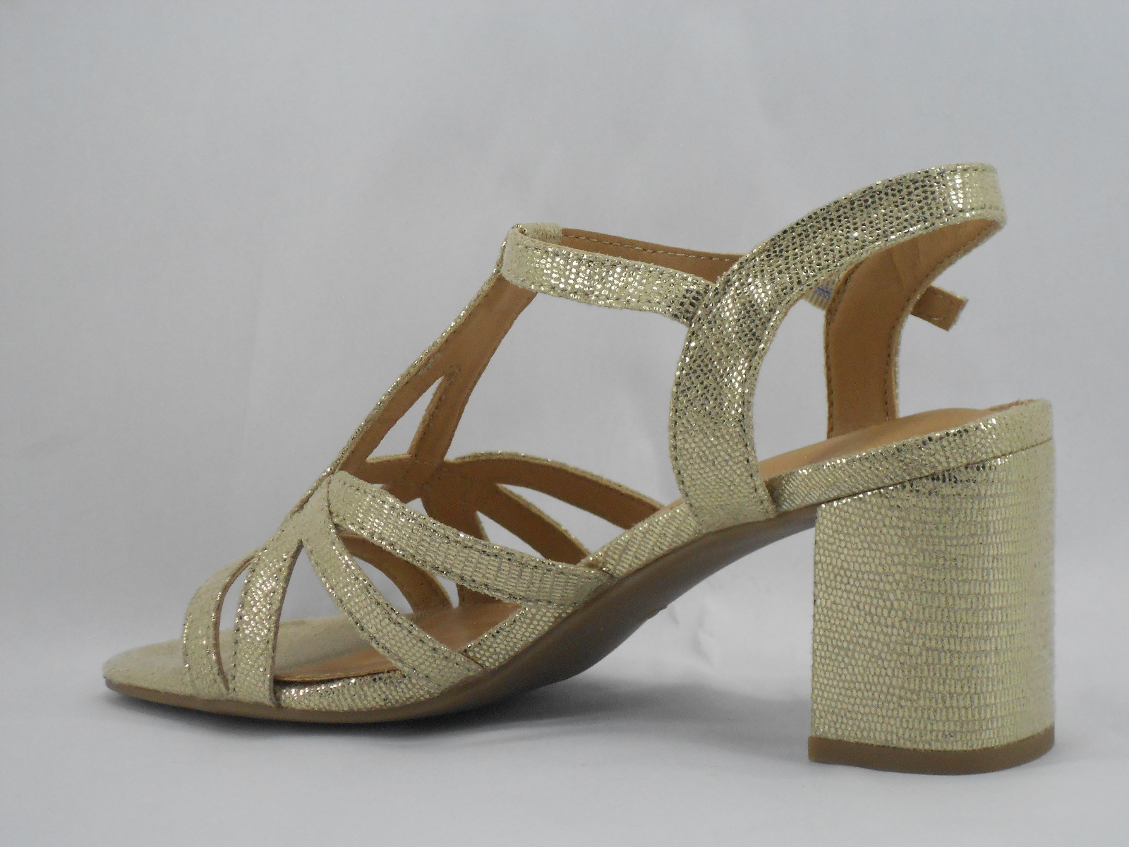 Elegante e feminina, esta sandália prateada destaca-se pelo seu design sofisticado com tiras finas cruzadas que envolvem o pé com delicadeza. O acabamento metalizado acrescenta brilho ao visual, tornando-a ideal para ocasiões especiais ou para complementar looks mais requintados. O salto médio proporciona equilíbrio entre estilo e conforto.