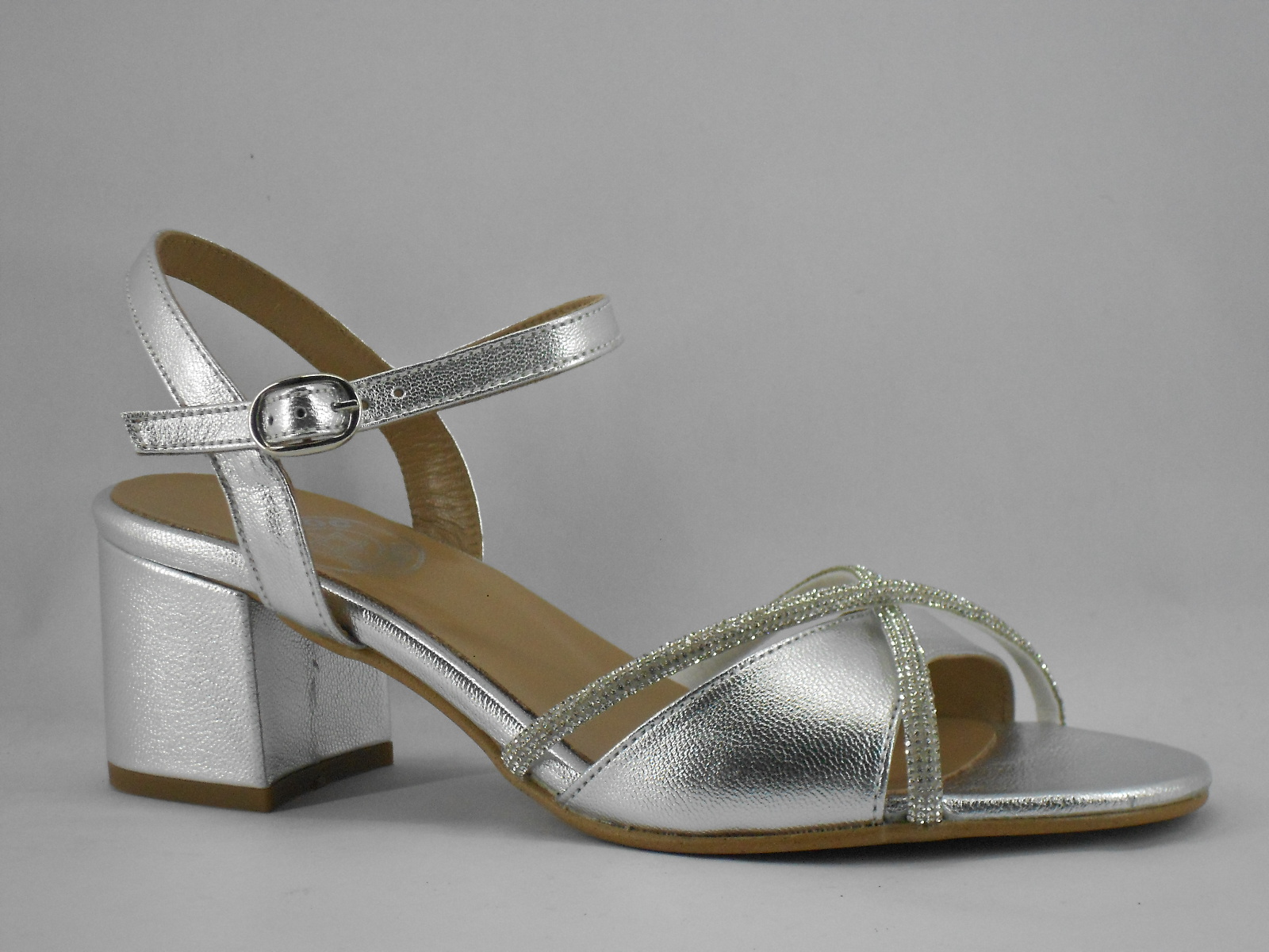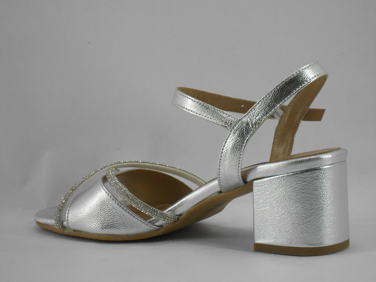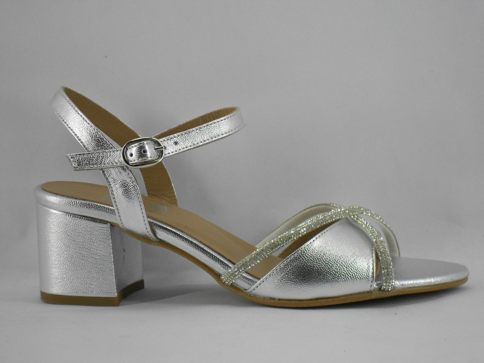Ideal para brilhar em ocasiões especiais, esta sandália prateada destaca-se pelo seu acabamento metalizado e pelas tiras finas com aplicação de brilho, que conferem um toque sofisticado e elegante ao visual. A fivela ajustável no tornozelo proporciona segurança e conforto ao caminhar.