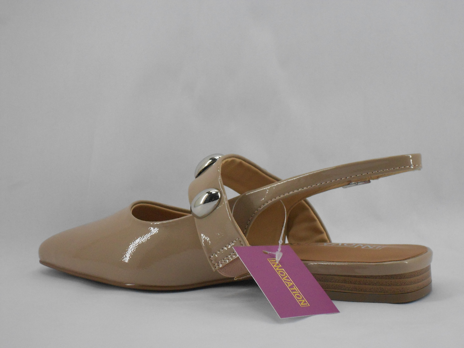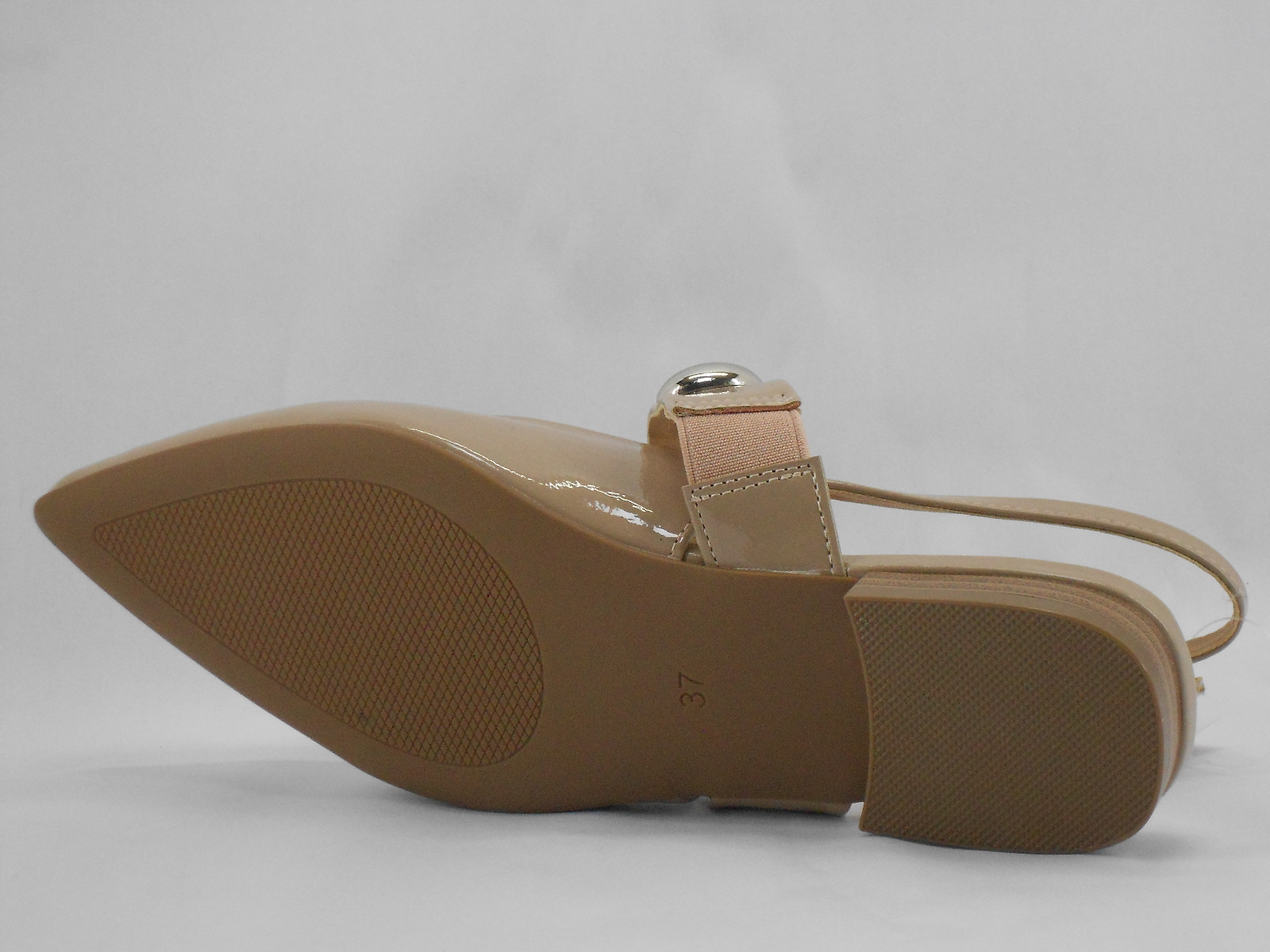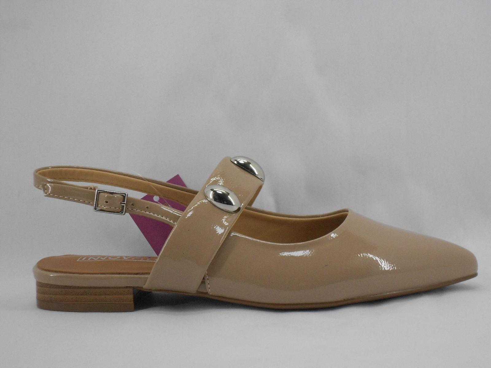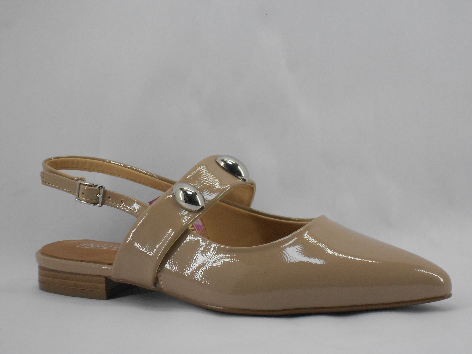 Elegante e contemporâneo, este sapato slingback bege em verniz destaca-se pelo seu acabamento brilhante e pelo detalhe metálico na parte superior, que acrescenta um toque sofisticado ao conjunto. O design aberto atrás com tira ajustável garante conforto e leveza, sendo ideal para looks formais ou ocasiões especiais.