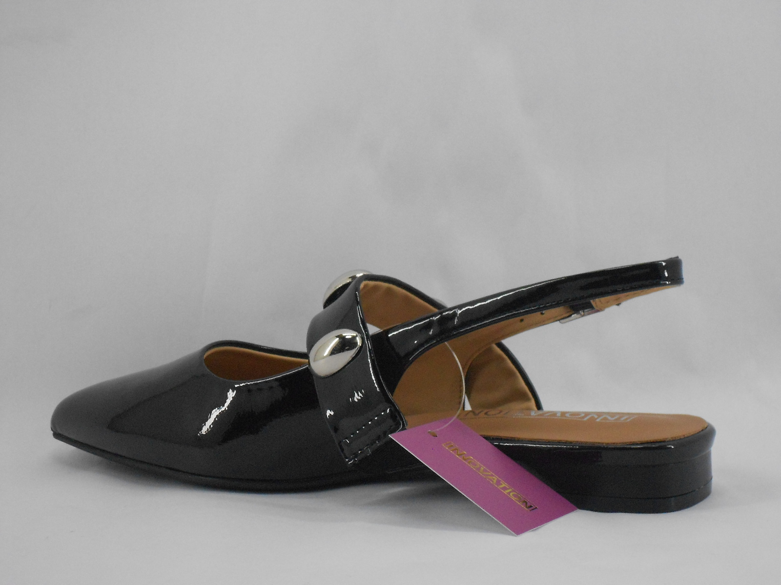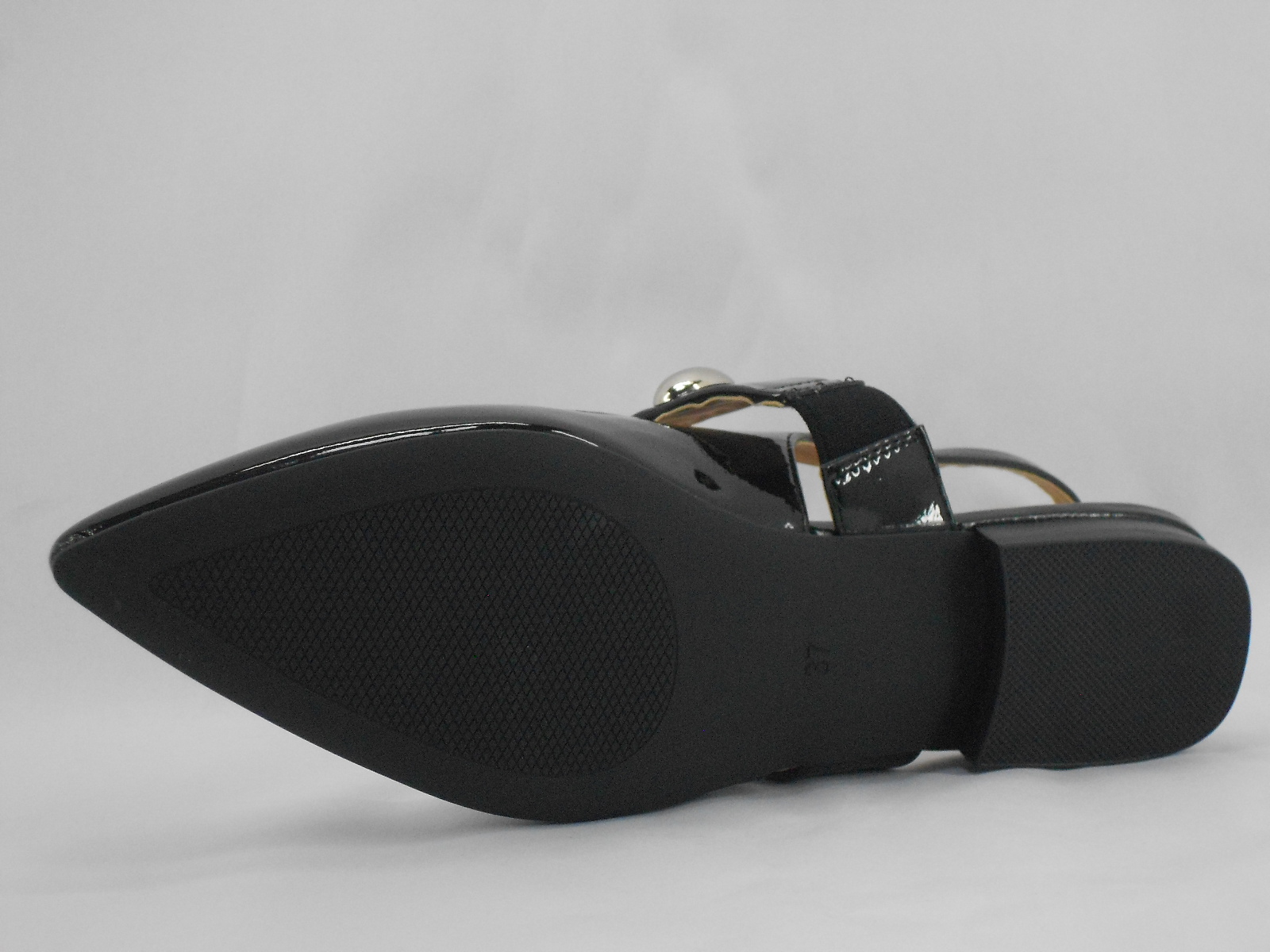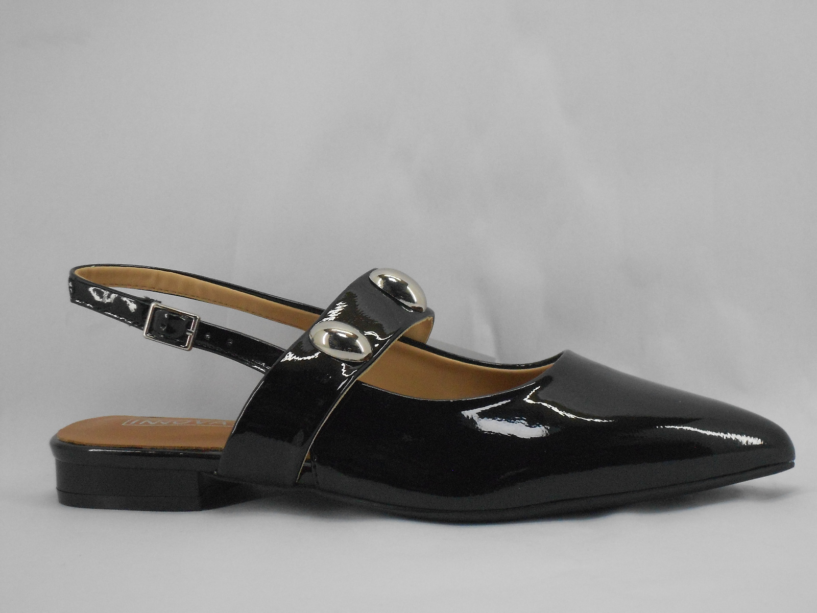 Elegante e contemporâneo, este sapato slingback preto em verniz destaca-se pelo seu acabamento brilhante e pelo detalhe metálico na parte superior, que acrescenta um toque sofisticado ao conjunto. O design aberto atrás com tira ajustável garante conforto e leveza, sendo ideal para looks formais ou ocasiões especiais.