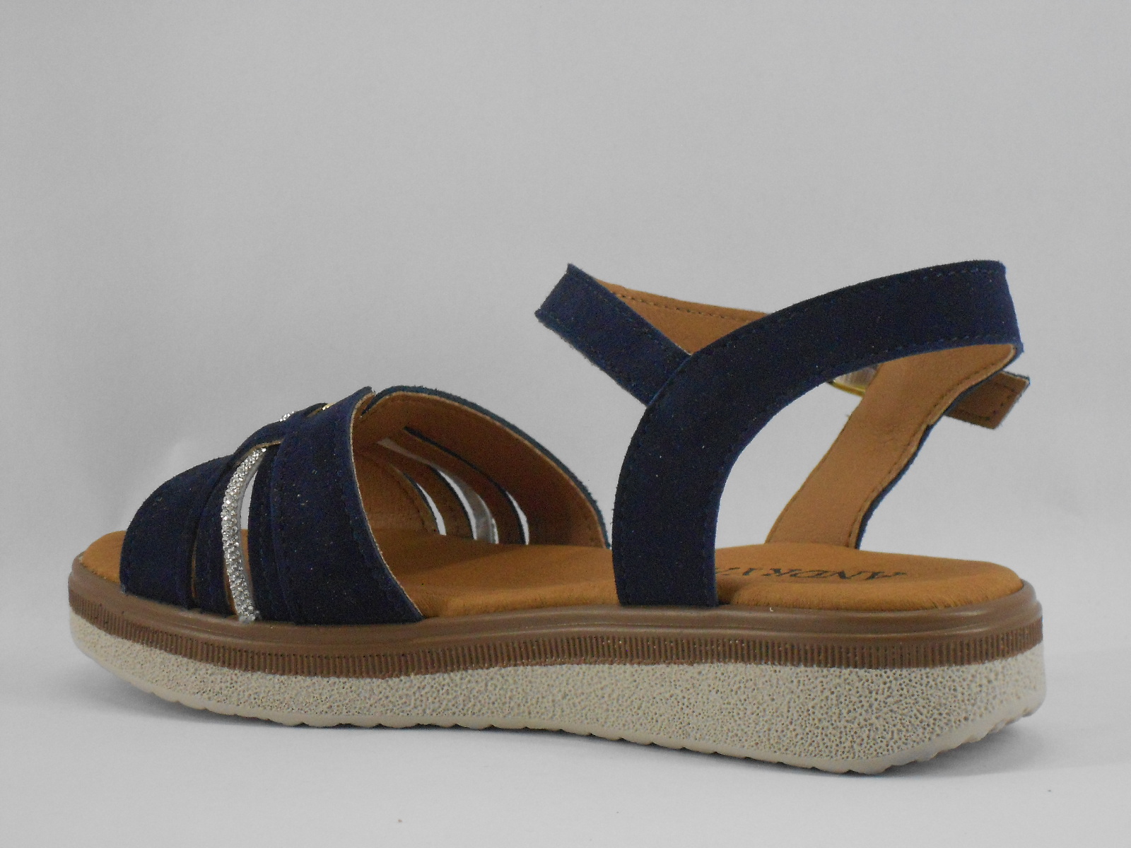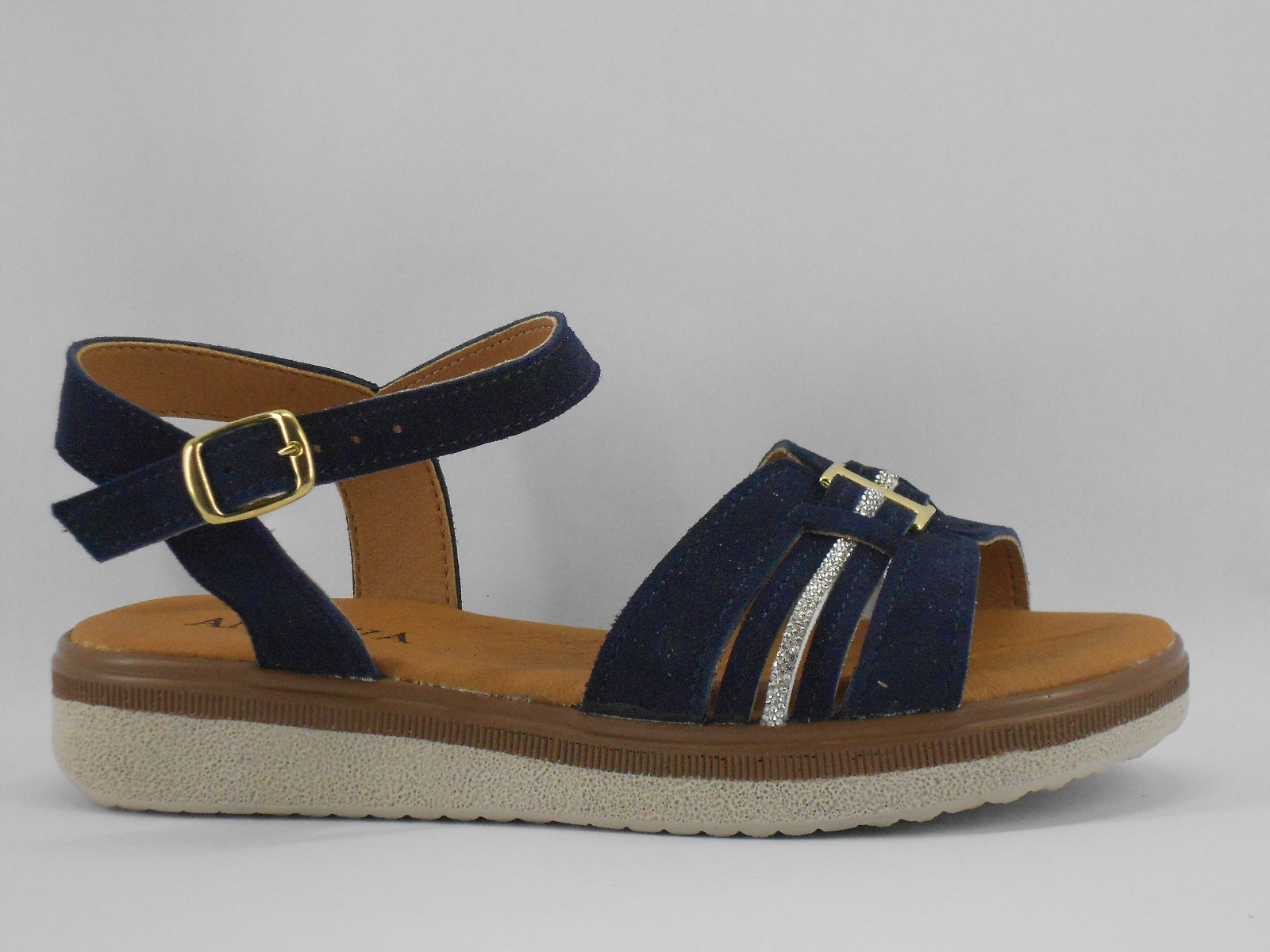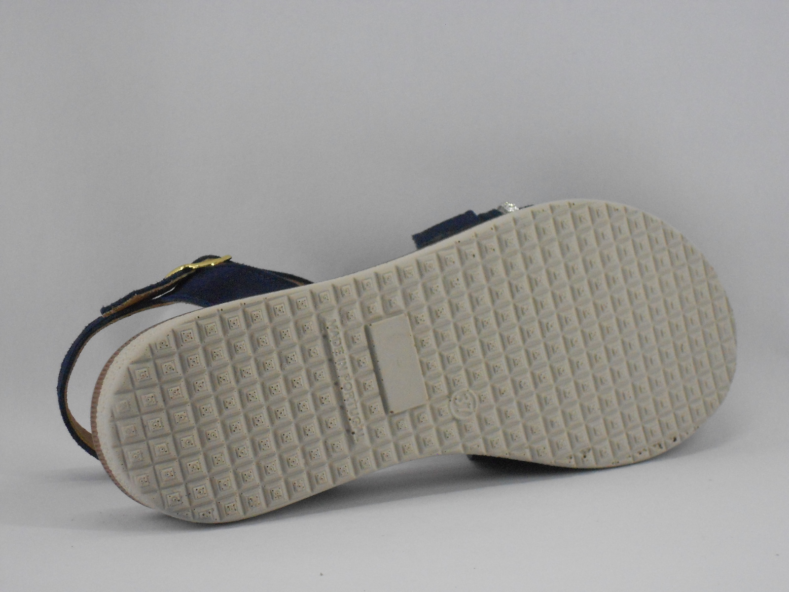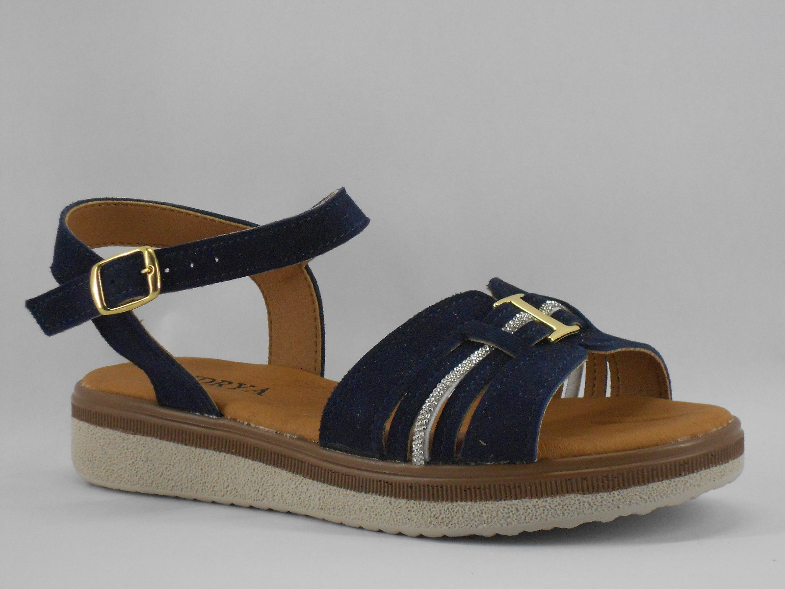 Perfeita para dias descontraídos com um toque de charme, esta sandália combina conforto e design moderno. As tiras em camurça azul marinho ganham destaque com os detalhes brilhantes e a fivela dourada decorativa, enquanto a sola leve e texturizada garante bem-estar durante todo o dia.