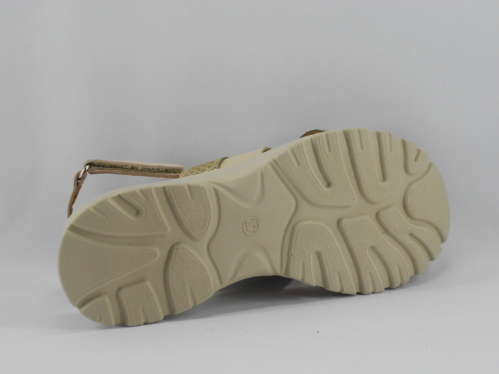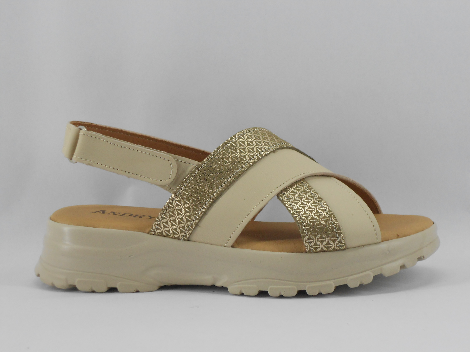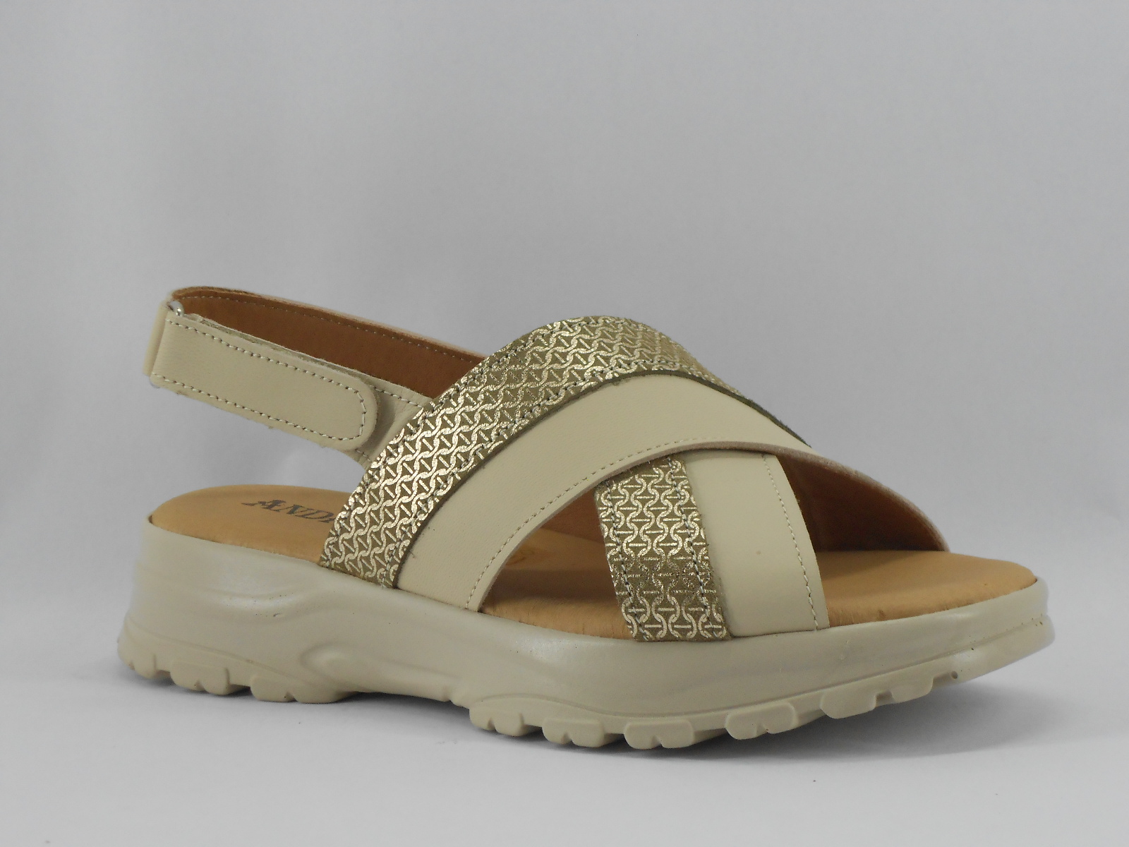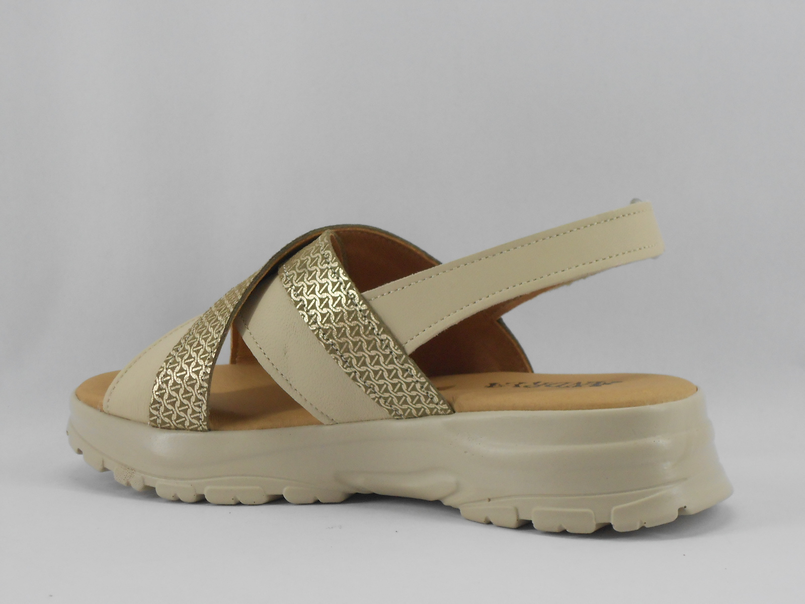 As tiras cruzadas combinam pele bege com pele metalizada, proporcionando ajuste perfeito ao pé, enquanto a sola anatómica oferece estabilidade e conforto prolongado