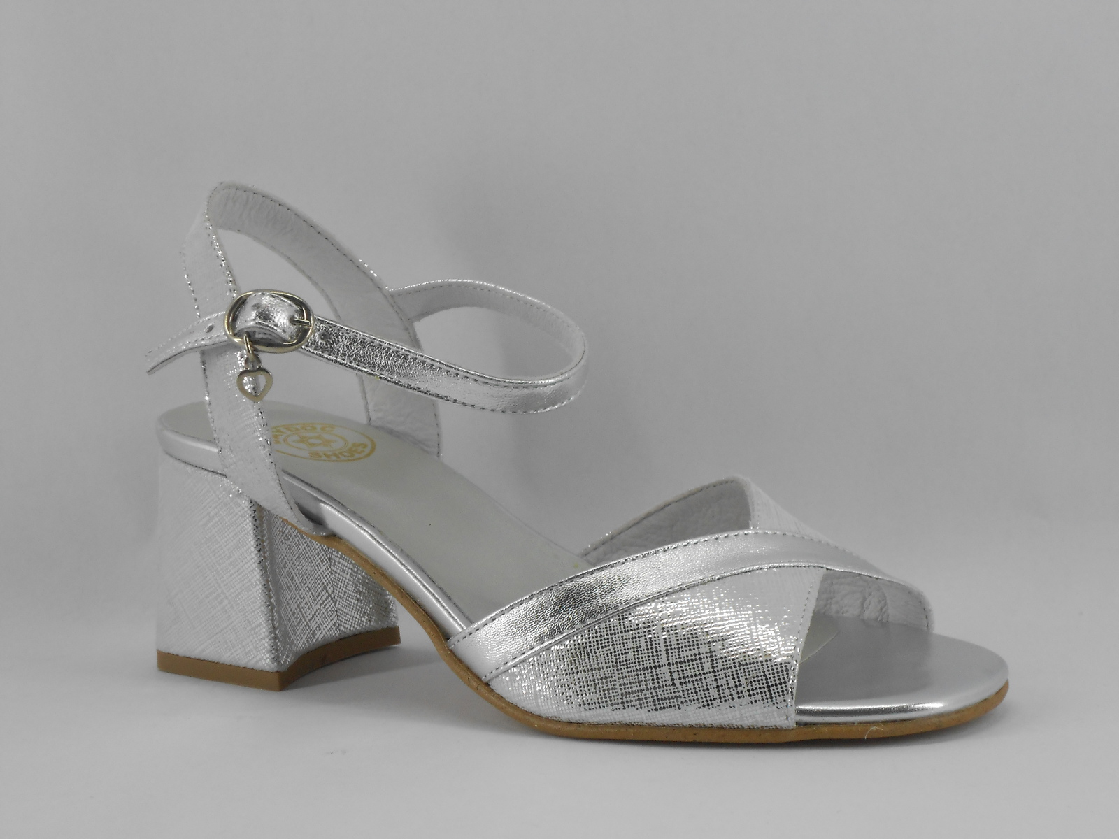 Com um design moderno e feminino, esta sandália prateada destaca-se pelo acabamento texturizado e pelo delicado pendente em forma de coração junto à fivela