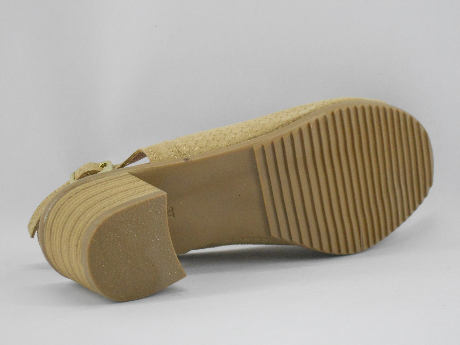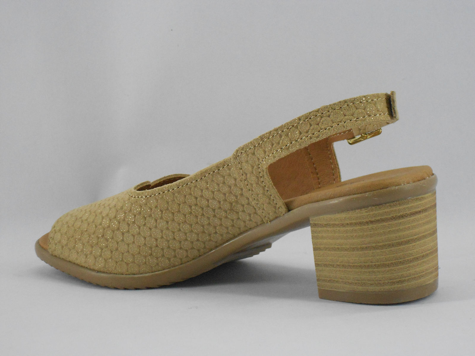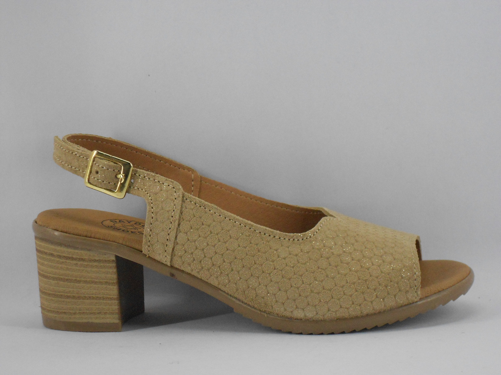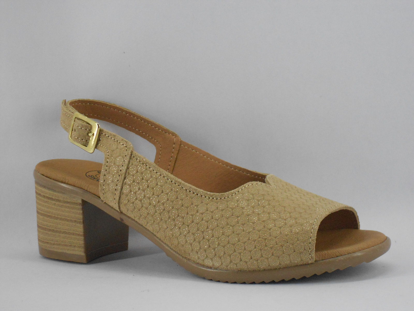 Elegantes e confortáveis, estas sandálias de salto médio são a escolha ideal para os dias mais quentes. O acabamento bege com textura hexagonal discreta e ligeiro brilho confere um toque sofisticado e versátil, perfeito para combinar com diversos estilos, desde o casual ao mais refinado.