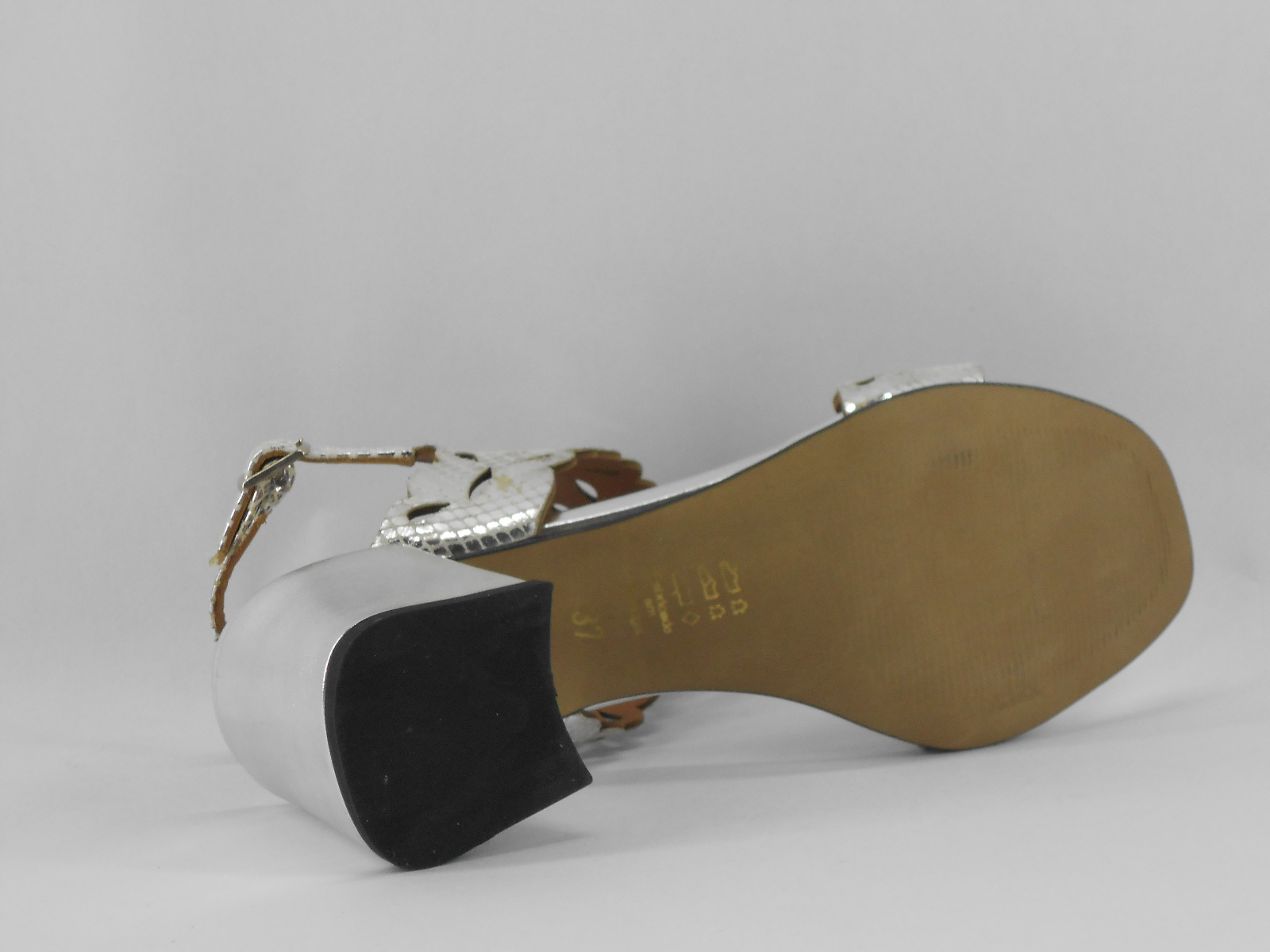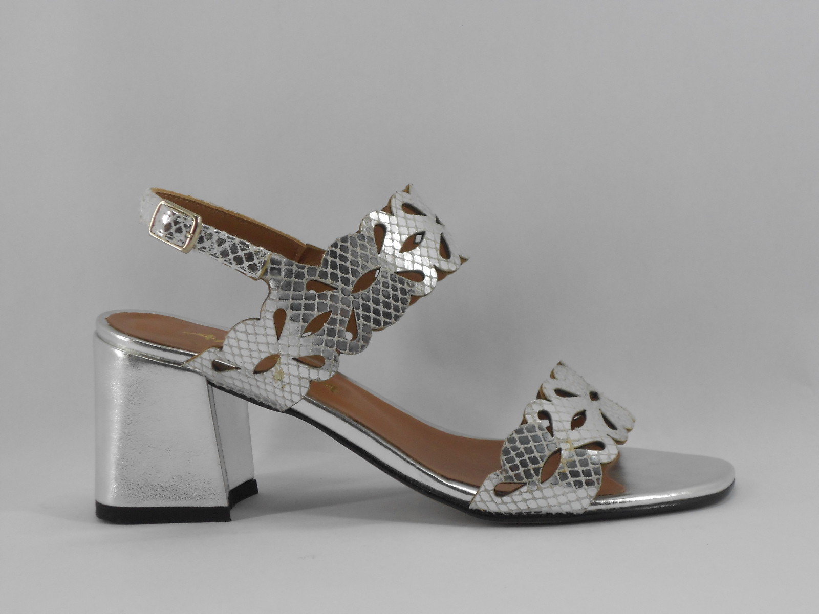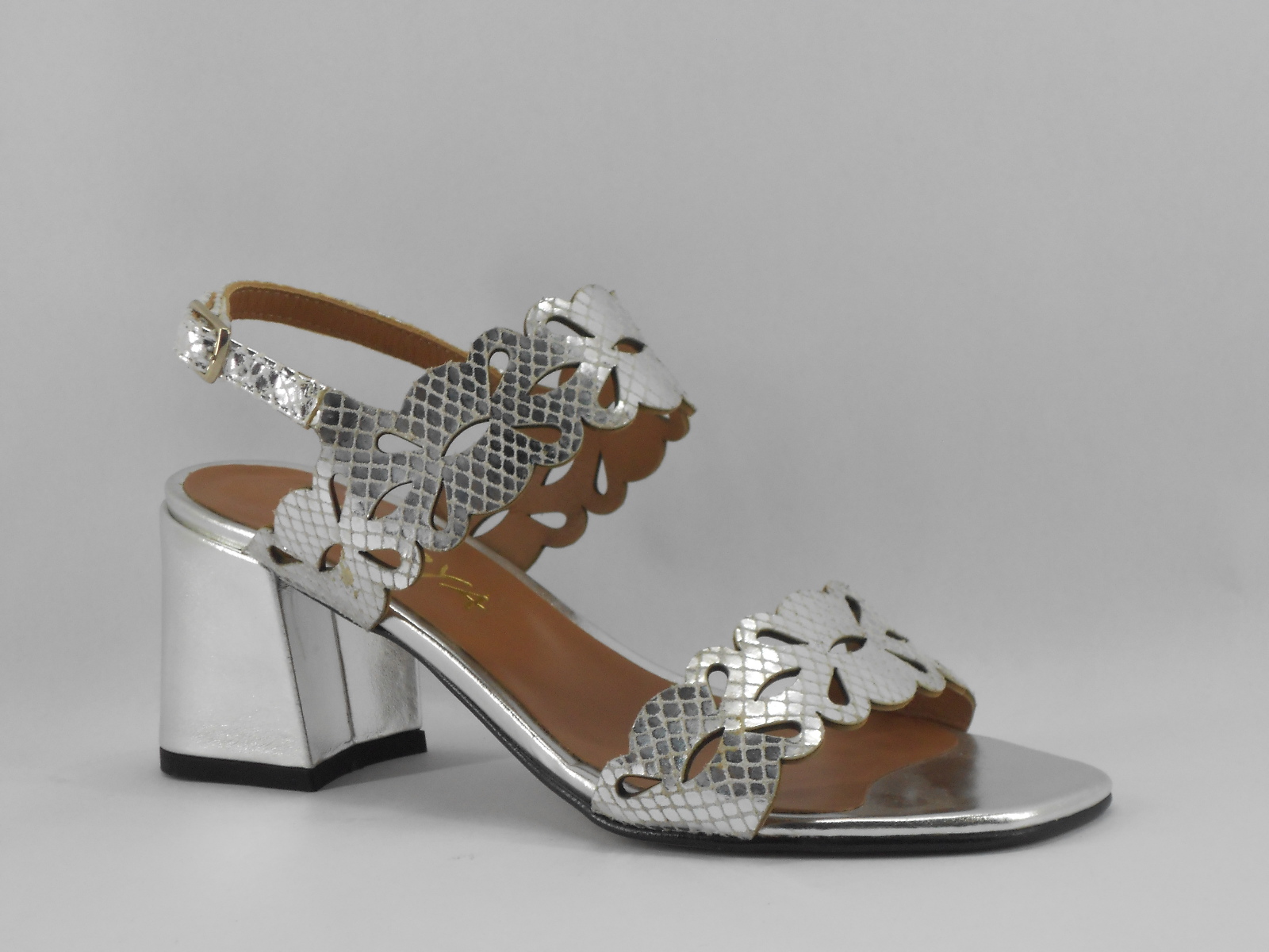 Sandália Prateada com Recortes Florais e Salto Largo