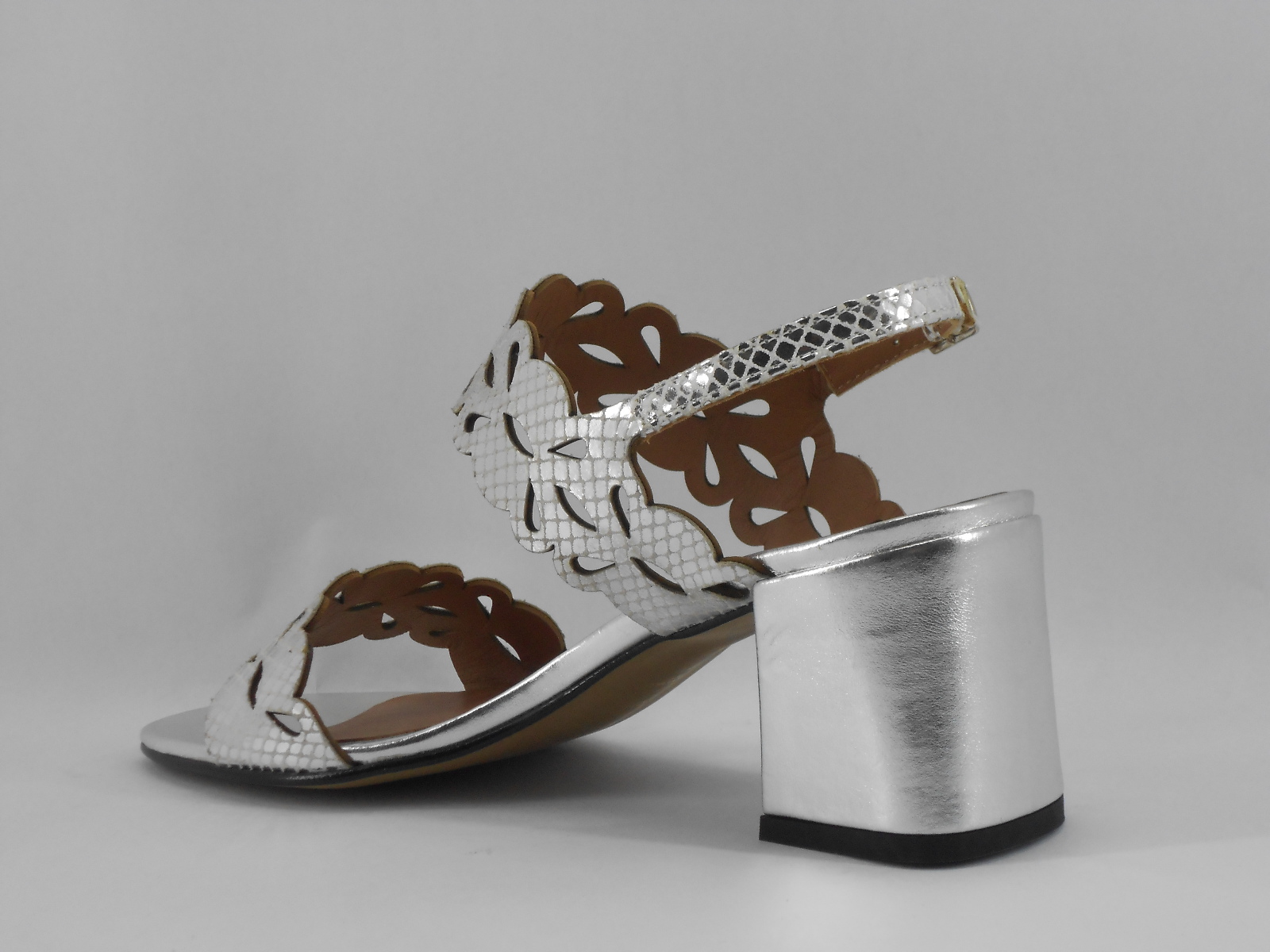 Com um design marcante e feminino, esta sandália prateada apresenta tiras com recortes florais detalhados e textura estilo escama para um efeito sofisticado e moderno