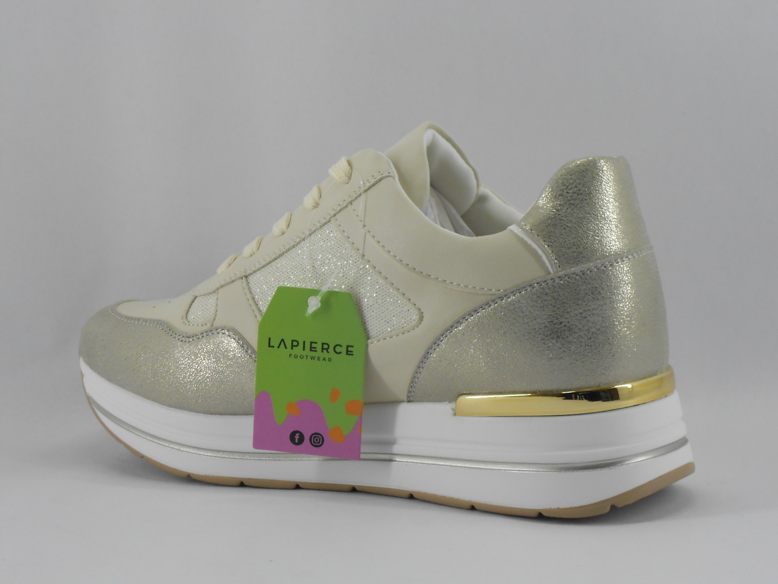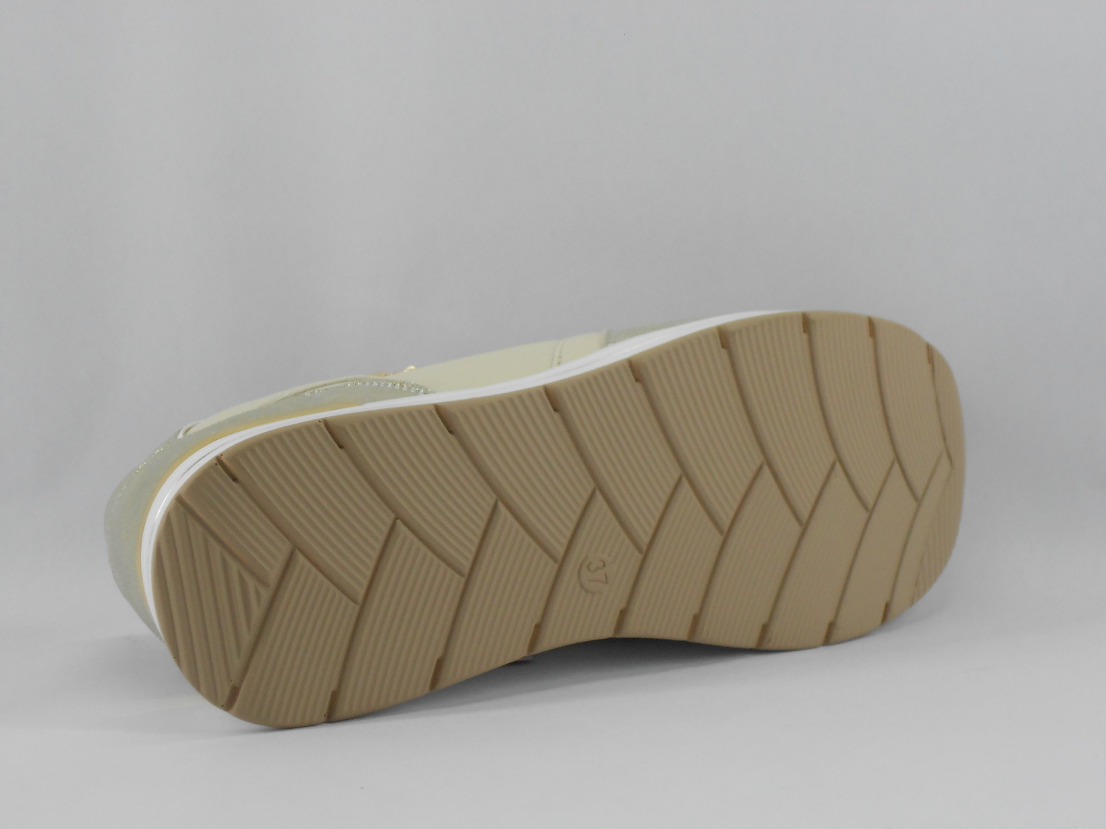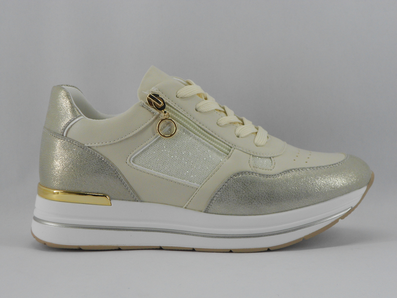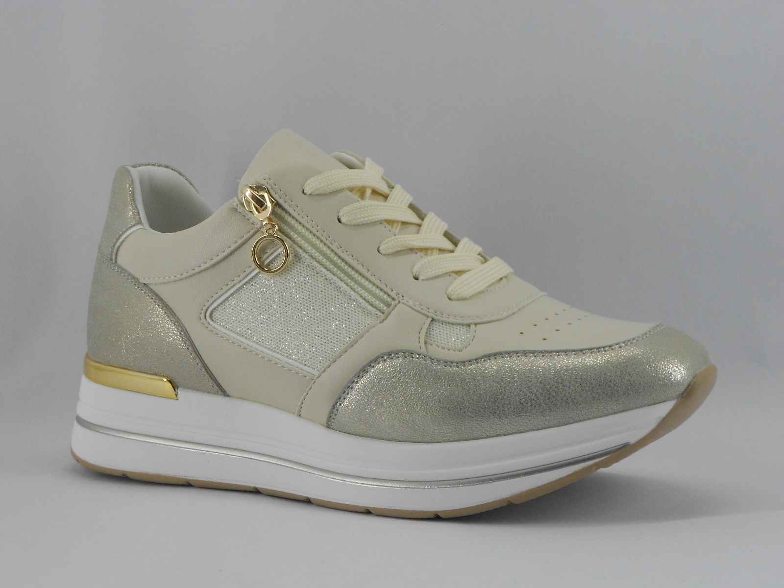 Este moderno tênis feminino é ideal para quem procura conforto com um toque de glamour A combinação do tom bege com detalhes dourados e acabamento metalizado confere ao modelo um visual elegante e sofisticado
