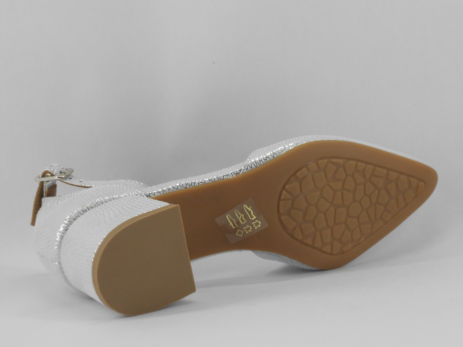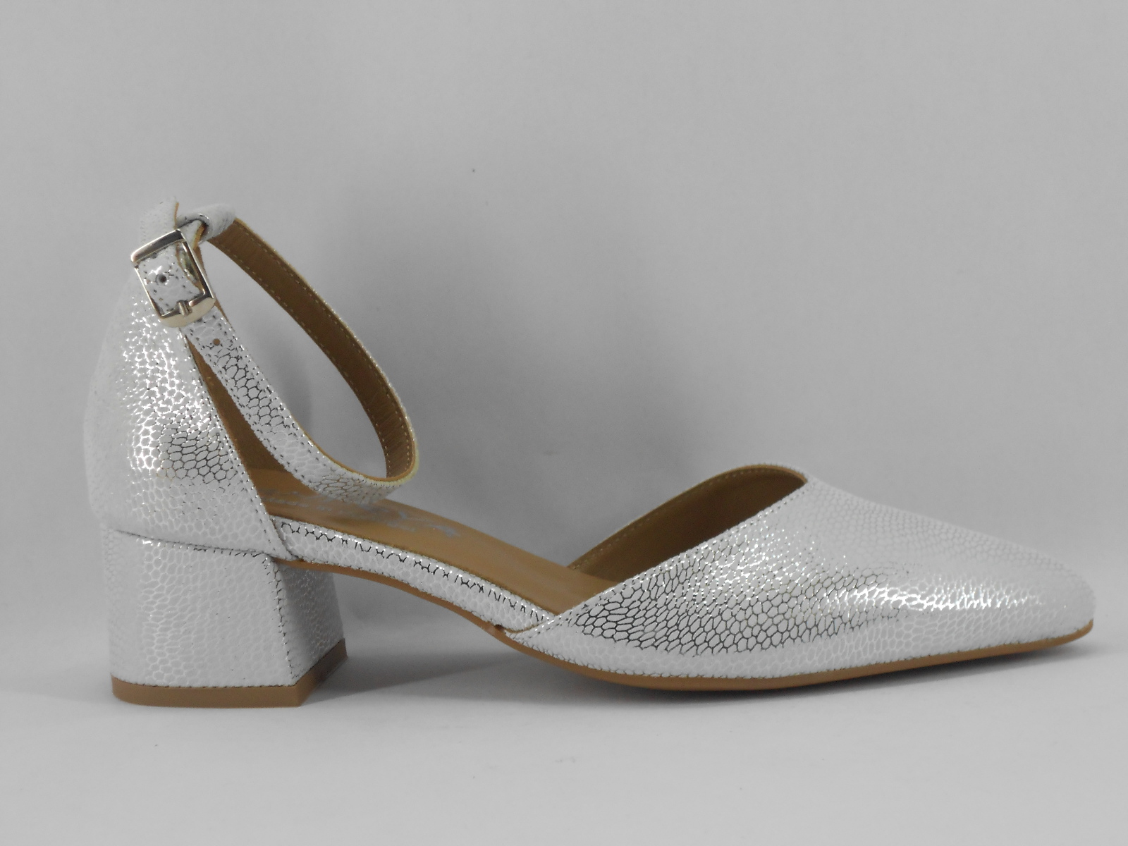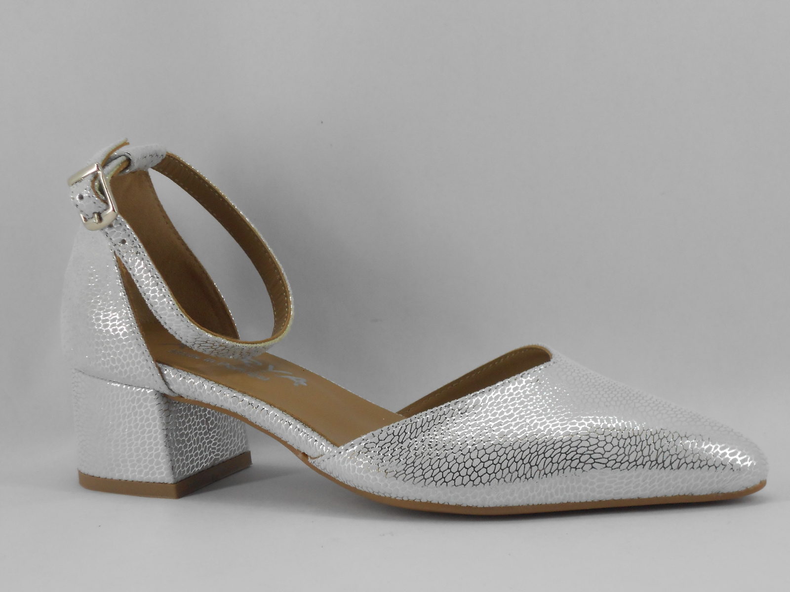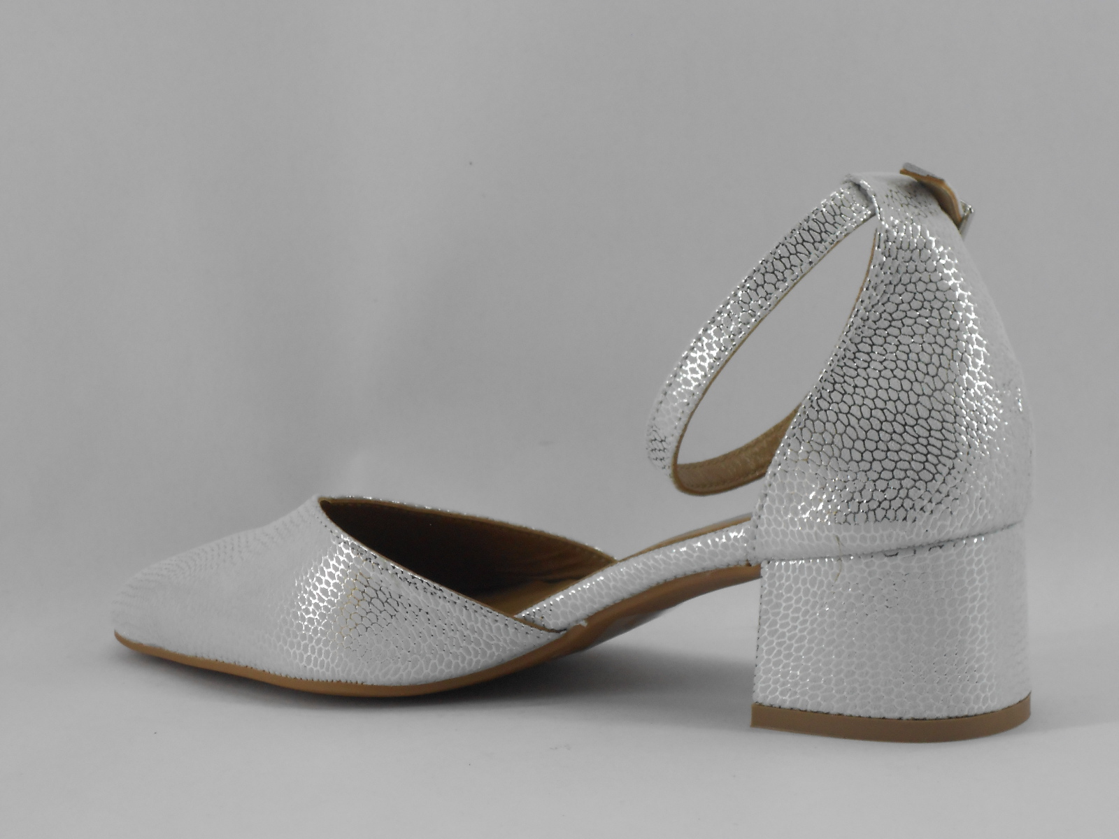Este sapato feminino de salto médio destaca-se pelo seu acabamento prateado texturizado, que confere brilho e sofisticação a qualquer look. O design moderno com bico fechado e tira com fivela ao tornozelo proporciona um toque elegante e feminino, ideal tanto para ocasiões formais como para momentos mais casuais com estilo.