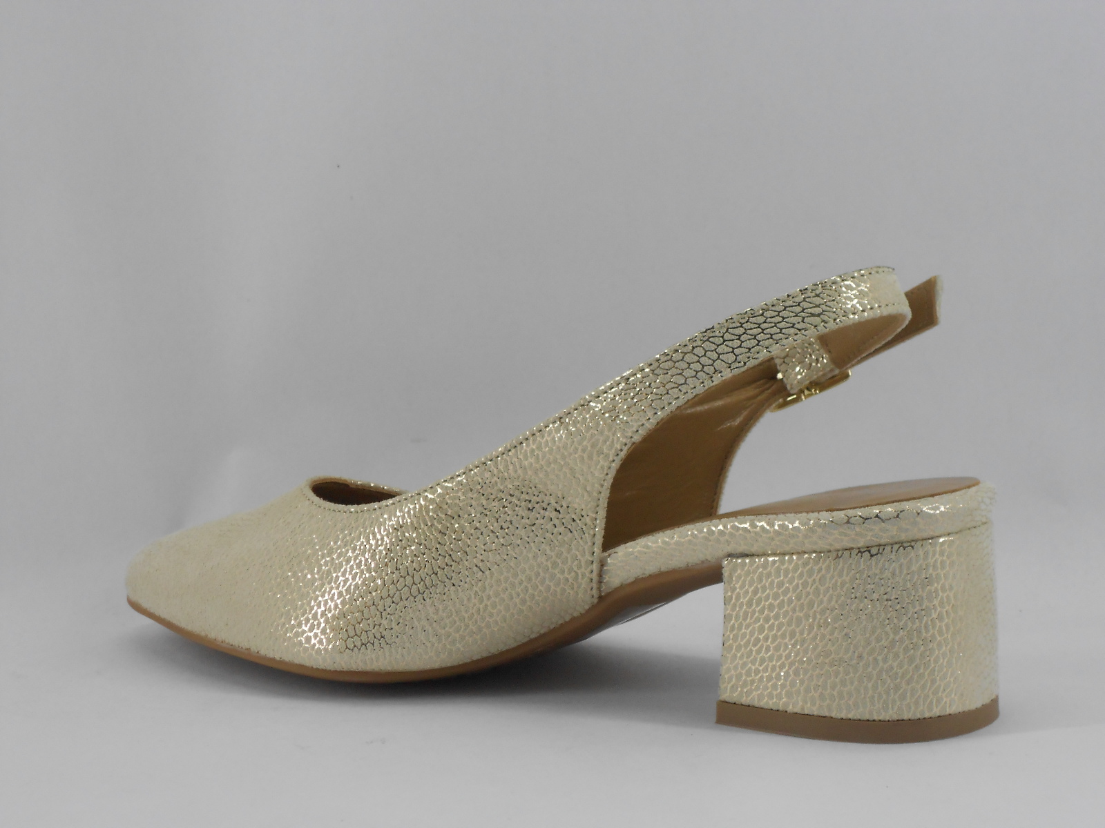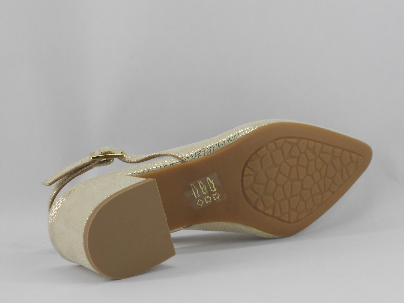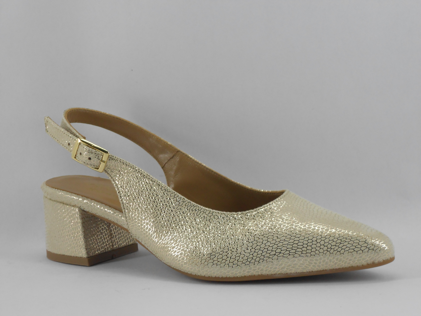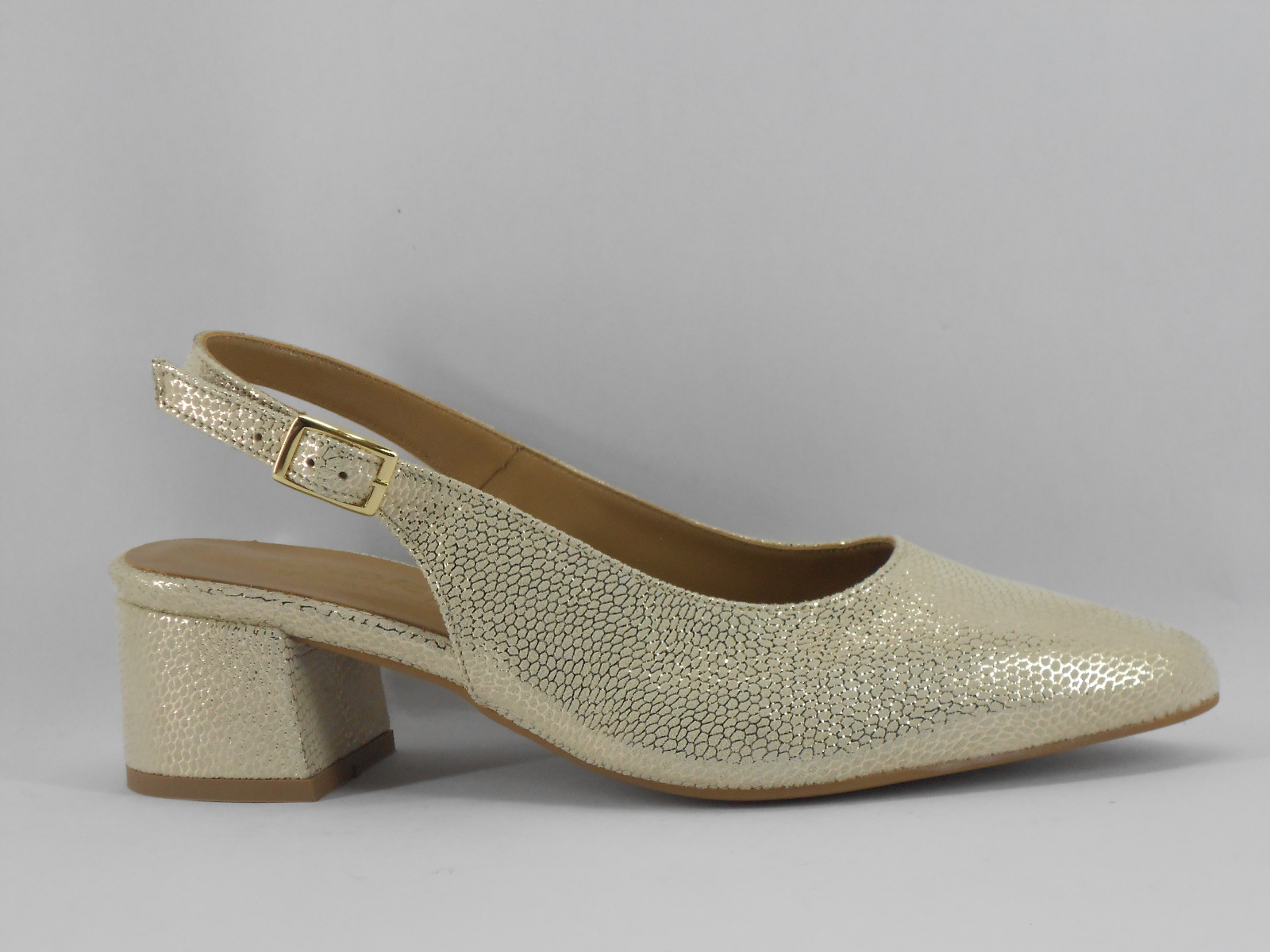 Elegante e moderno, este sapato slingback feminino destaca-se pelo seu acabamento prateado com textura metalizada, ideal para quem procura um toque de sofisticação em ocasiões especiais ou eventos formais. O design aberto no calcanhar com tira ajustável garante conforto e estabilidade ao caminhar, enquanto o salto largo oferece equilíbrio e segurança sem comprometer o estilo.