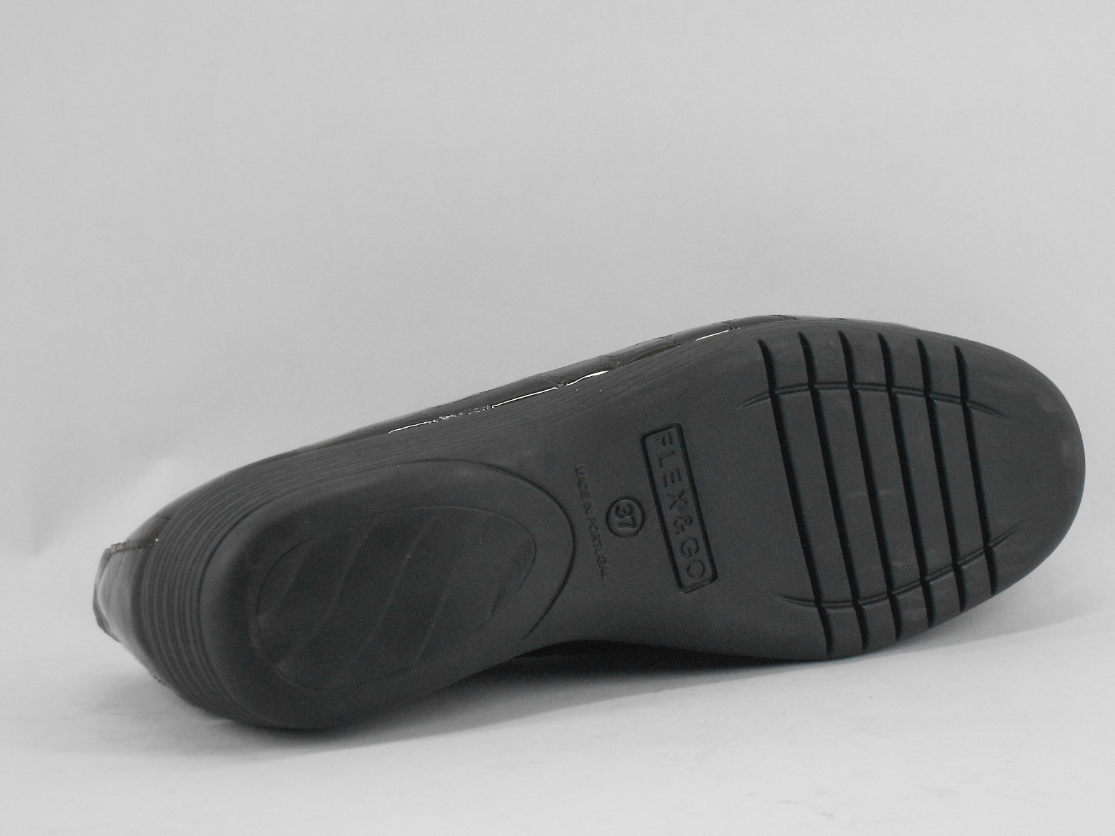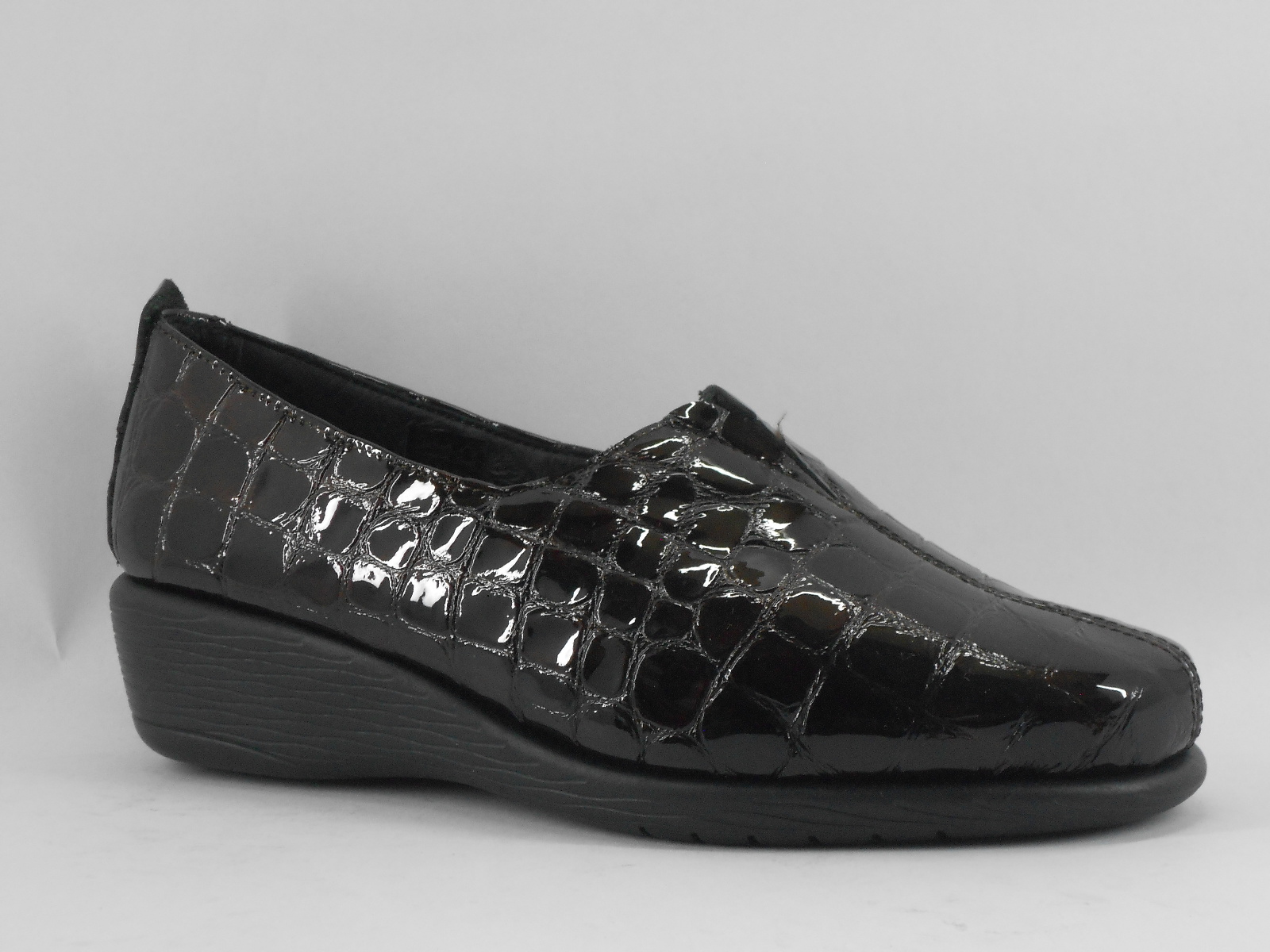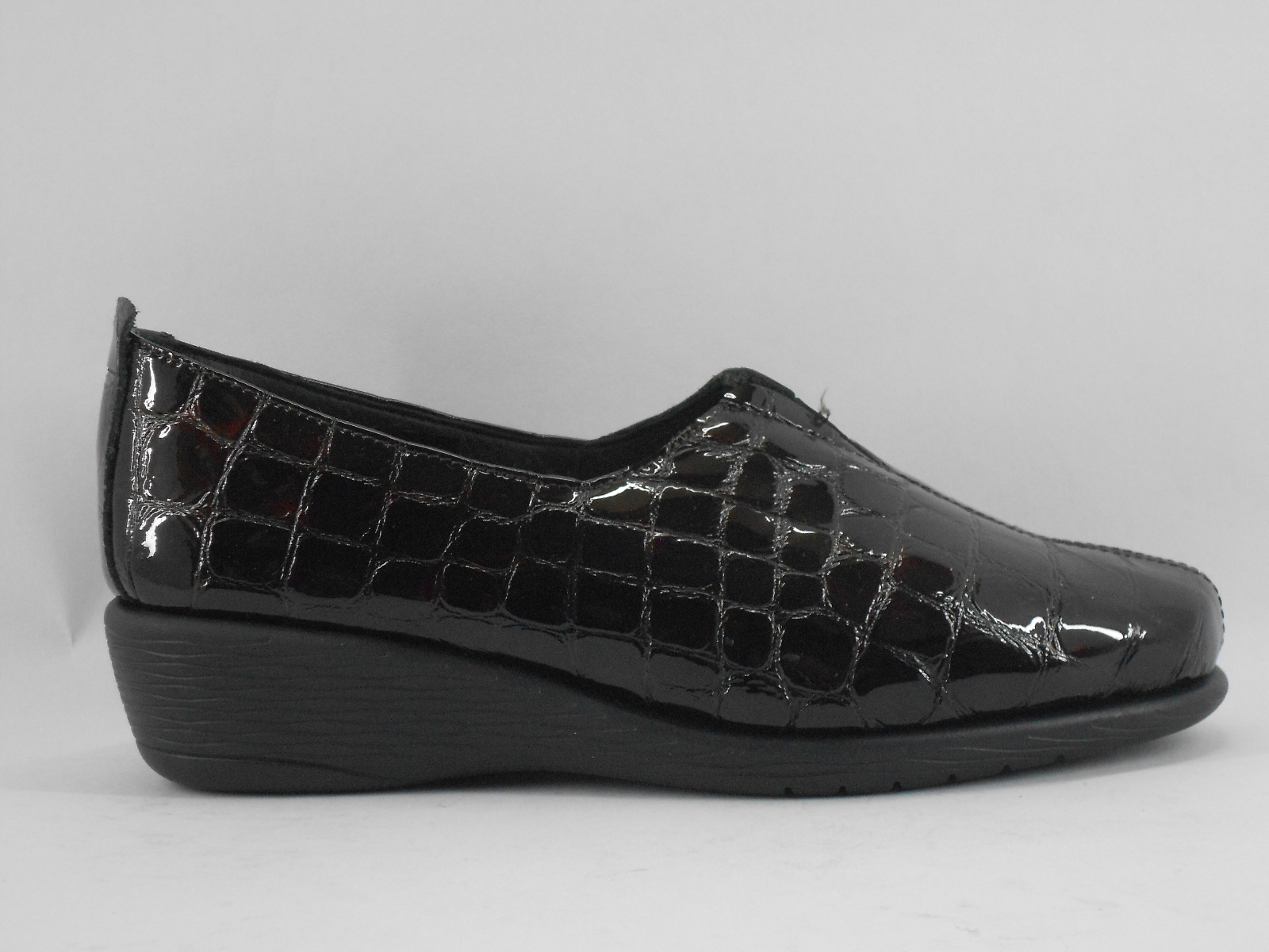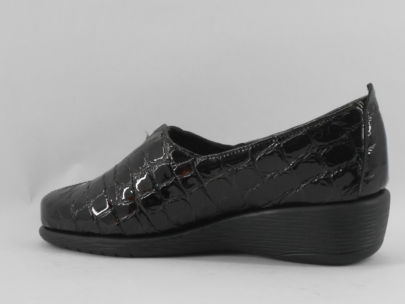 Este sapato feminino preto combina elegância e conforto num design sofisticado e versátil. O acabamento envernizado com textura croco confere um toque de modernidade e requinte, ideal para complementar visuais clássicos ou contemporâneos.