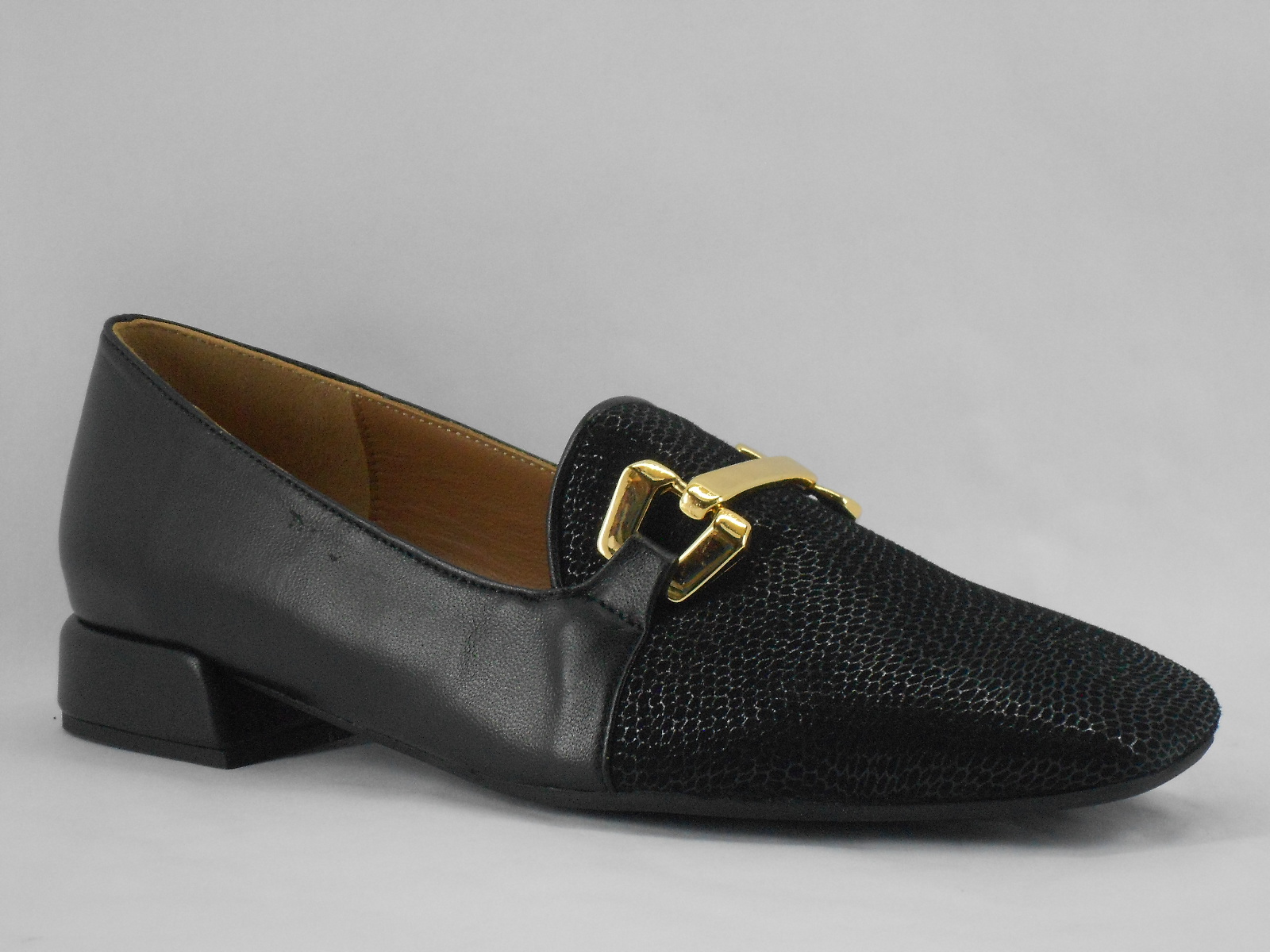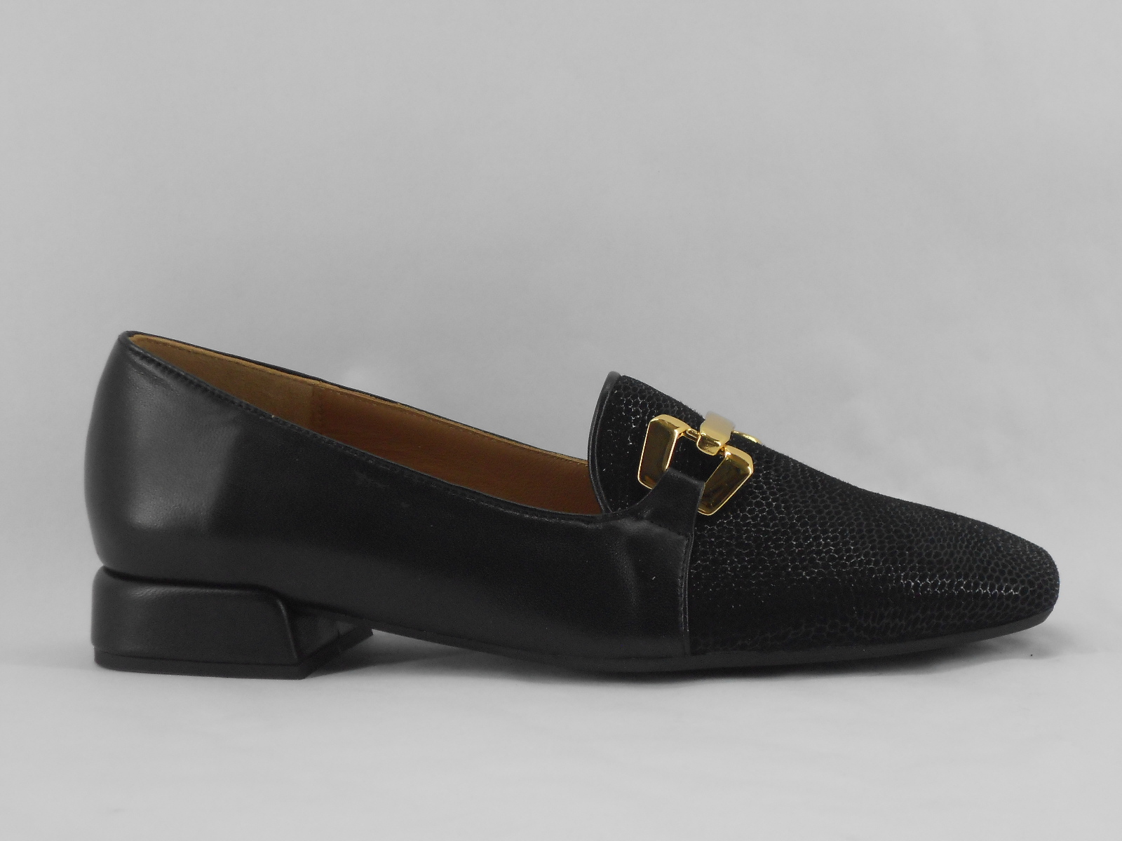 Sapatos Mocassim – Pretos com Detalhe Dourado e Salto Baixo