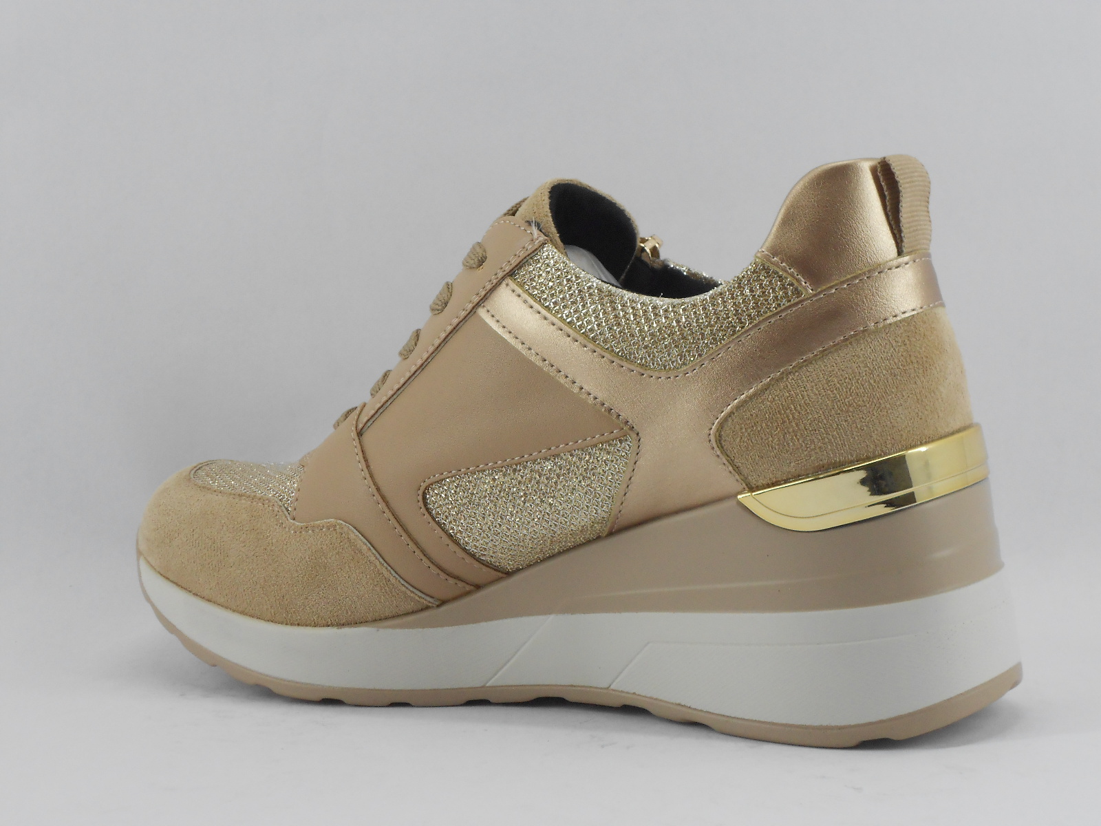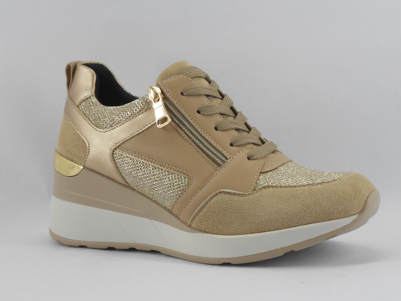 Moderno e versátil, este ténis em tons de bege combina diferentes texturas e acabamentos brilhantes, garantindo um visual elegante e descontraído para o dia a dia