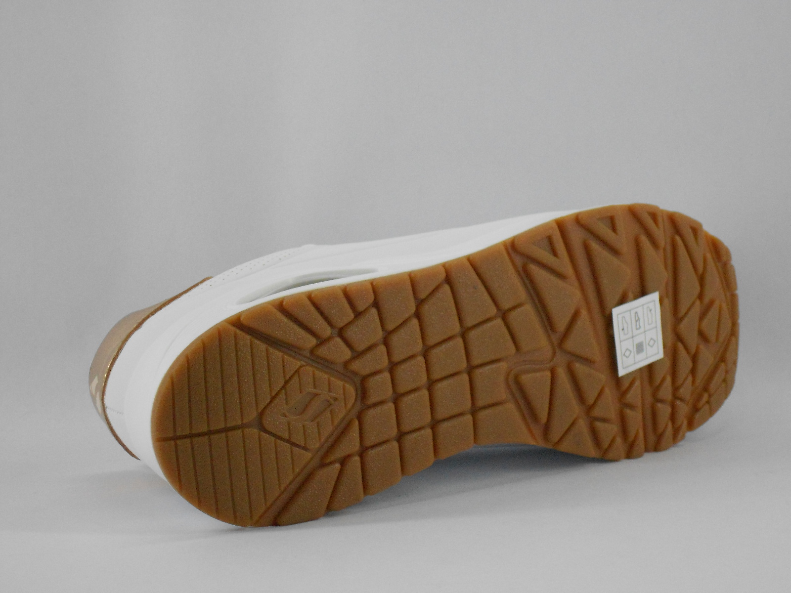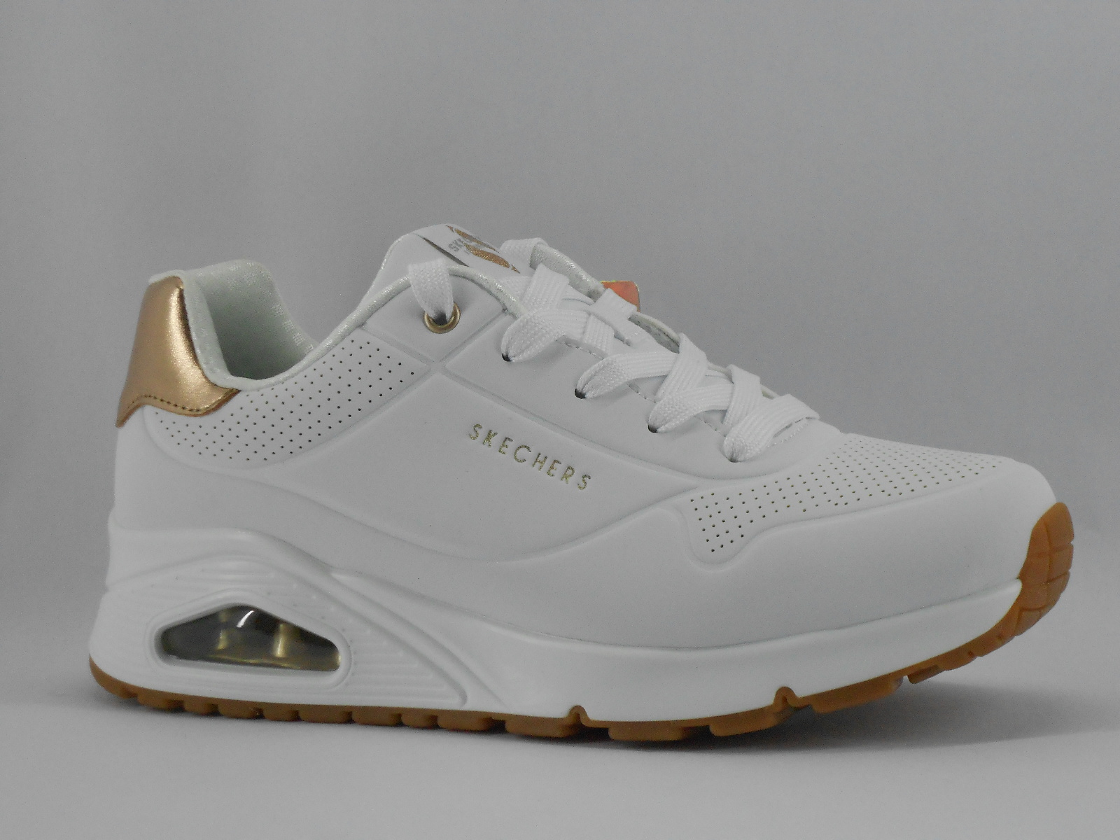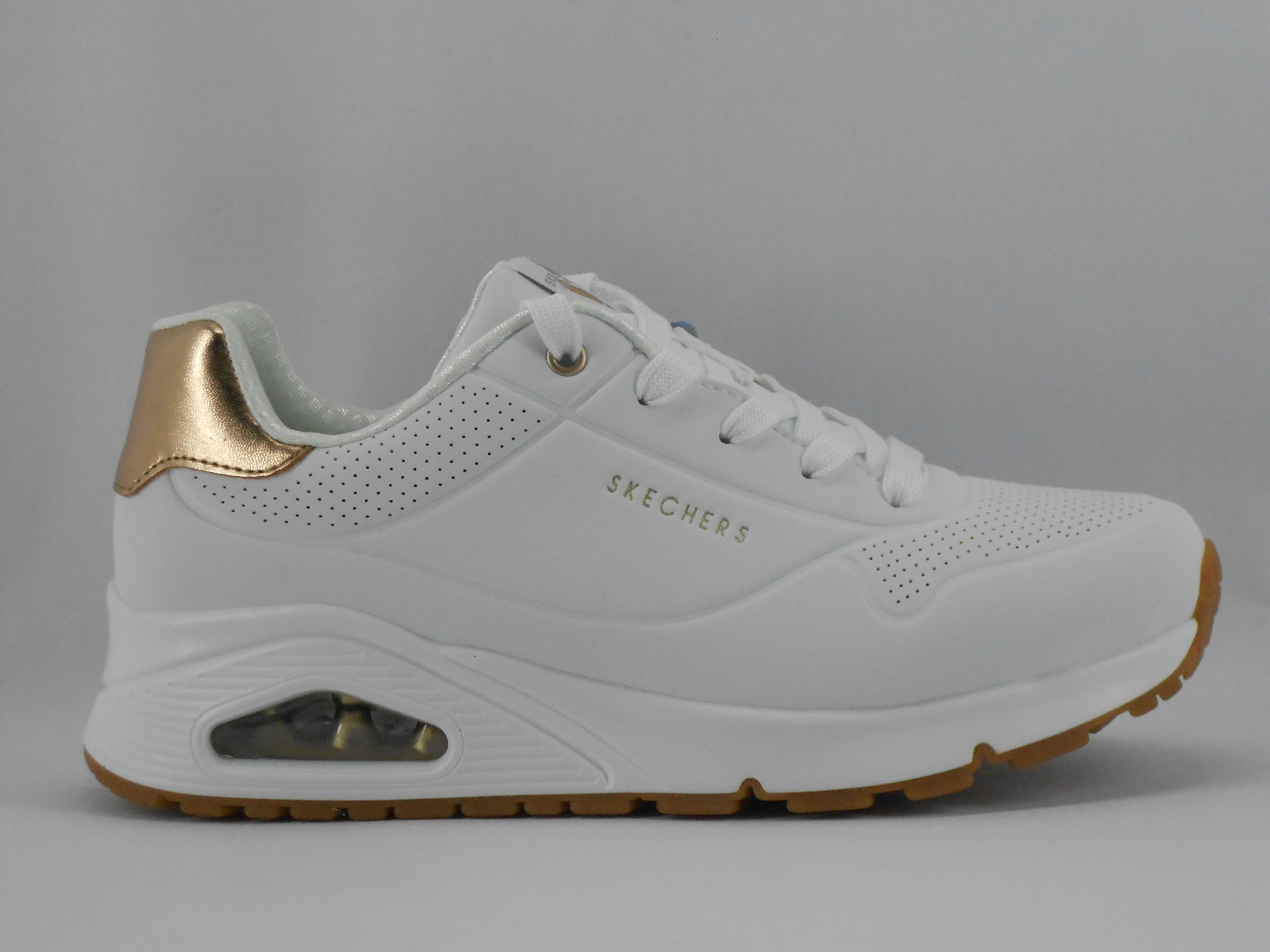 Um clássico moderno da marca Skechers, este modelo Uno Gen combina um visual desportivo com detalhes elegantes, destacando-se pela sua entressola com câmara de ar visível e acabamento em tons branco com apontamentos dourados
