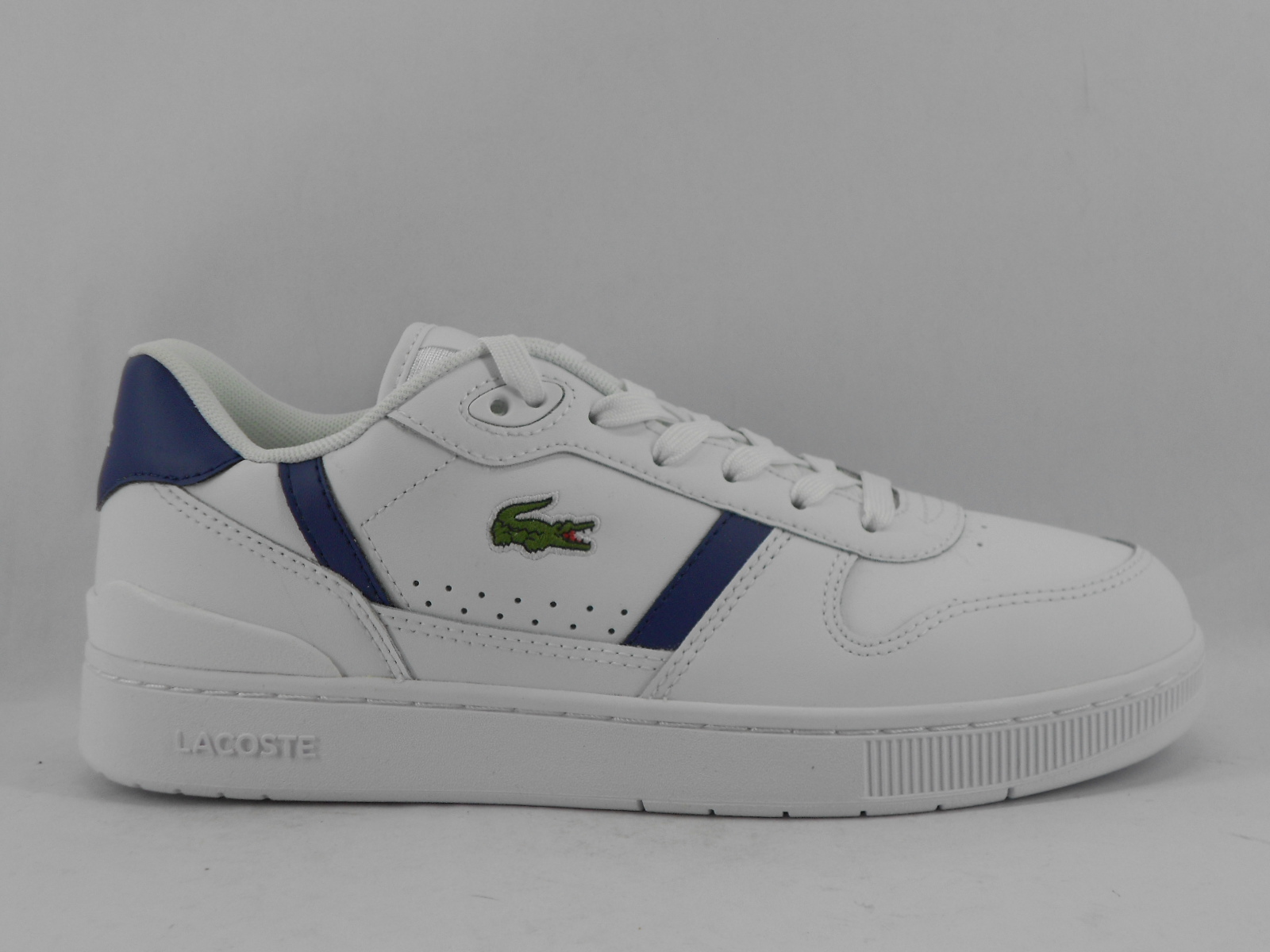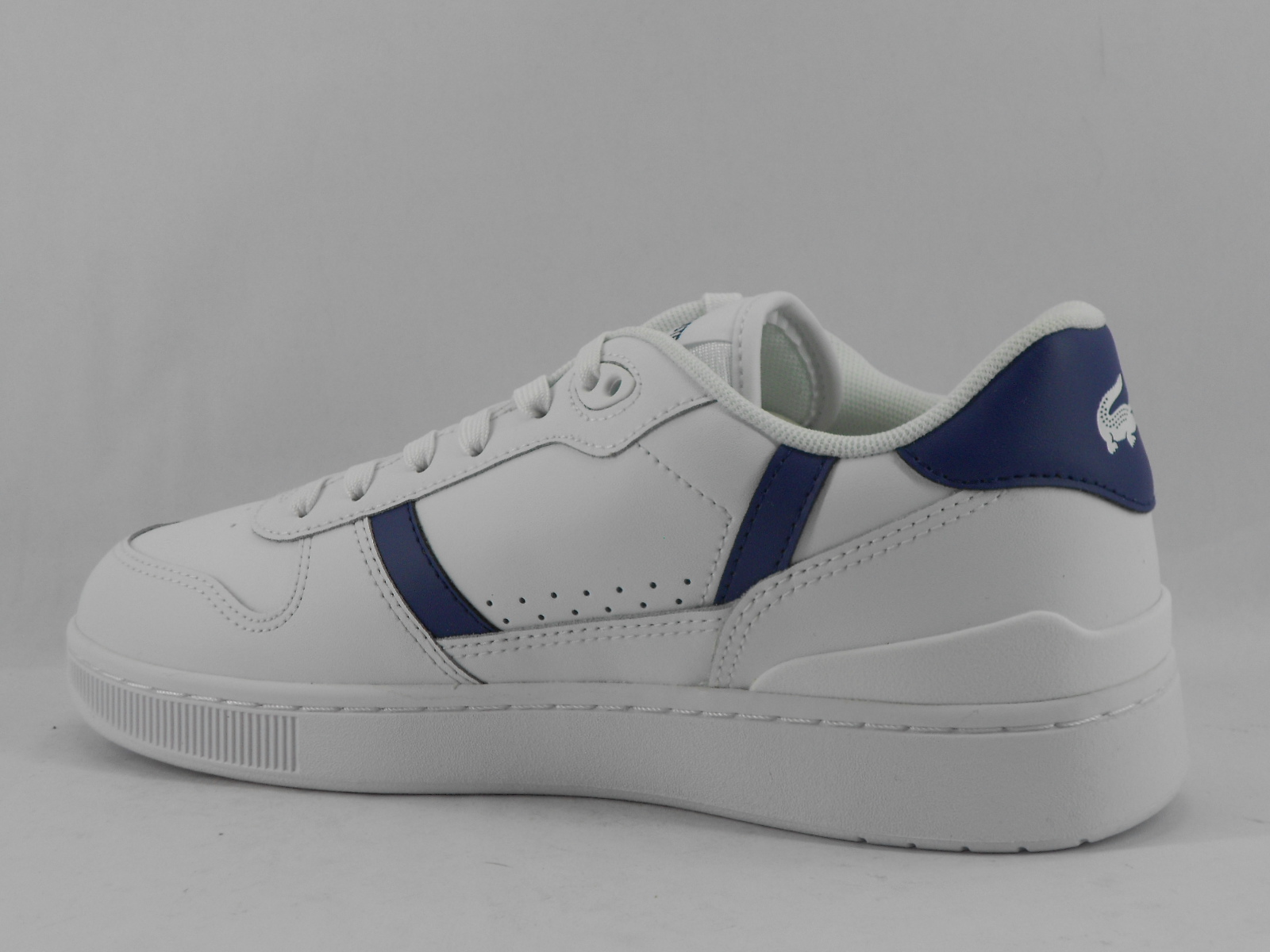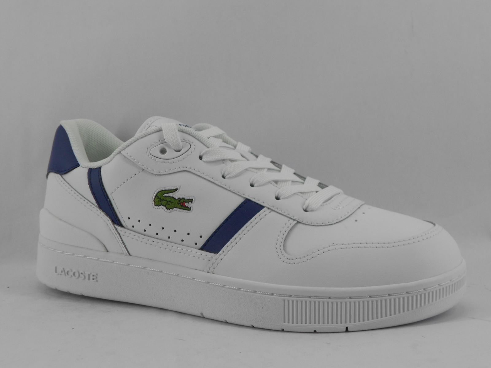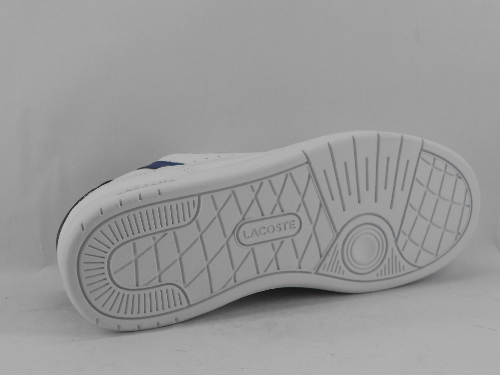 Este ténis branco da marca Lacoste destaca-se pelos detalhes em azul e pelo emblemático logótipo do crocodilo bordado na lateral, combinando estilo desportivo com um toque sofisticado