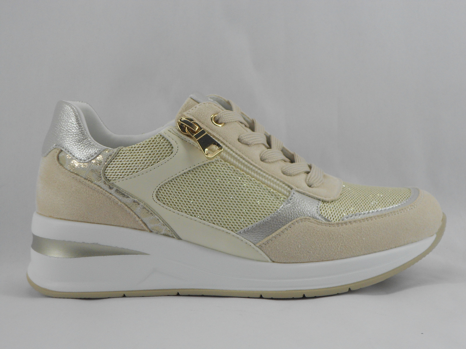 Ténis Bege com Malha Respirável, Detalhes Metalizados e Atacadores